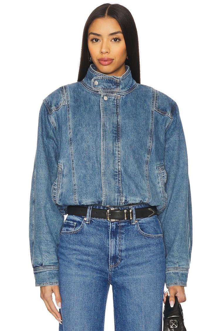 This relaxed fit blouson jacket in structured denim fabric features a waist-length cut and a stand collar with front zip and button closure. Designed with angled slip pockets and an additional interior pocket, it combines casual chic with practical utility. The elastic waistband enhances fit and comfort, while the long regular sleeves complete the classic silhouette. Lined with a cotton-polyester blend, this jacket is ideal for spring and autumn wear. Perfect for casual outings, street style looks, and travel, it blends modern style with timeless denim texture.