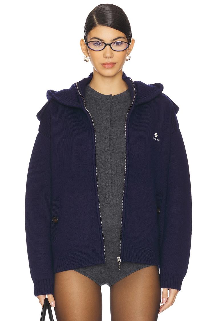 This relaxed-fit blouson jacket features a unique double collar design with a hood, crafted from a wool, polyester, and nylon blend knit fabric. The hip-length silhouette offers cozy warmth and casual comfort, enhanced by a front zipper closure and side pockets for practical wear. The deep matte dark blue hue adds a minimalist and modern vibe, perfect for streetwear or travel in cooler seasons like autumn and winter. Its versatile style and functional details make it an ideal choice for casual outings and layering.