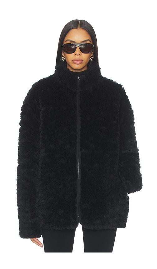 SKIMS FAUX FUR ZIP UP MOCK NECK JACKET IN BLACK.