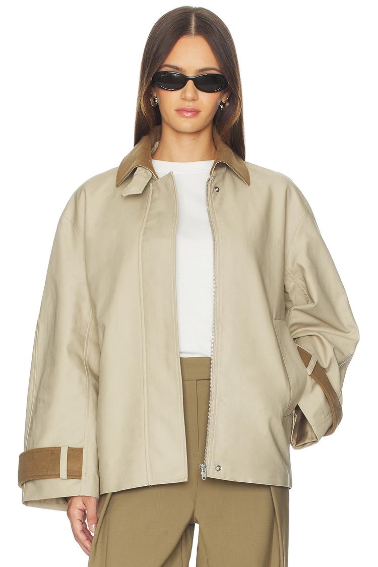 This boxy hip-length jacket features a stand collar and long regular sleeves, crafted in heavyweight cotton twill with a smooth polyester-viscose lining for comfort. Its minimalist beige design is accented by brown melton trim buckles on the cuffs, adding subtle detail. The front zipper closure and slant pockets offer practical functionality. Ideal for casual streetwear, travel, and transitional autumn to spring seasons, this modern jacket blends simplicity with utilitarian style for versatile everyday wear.