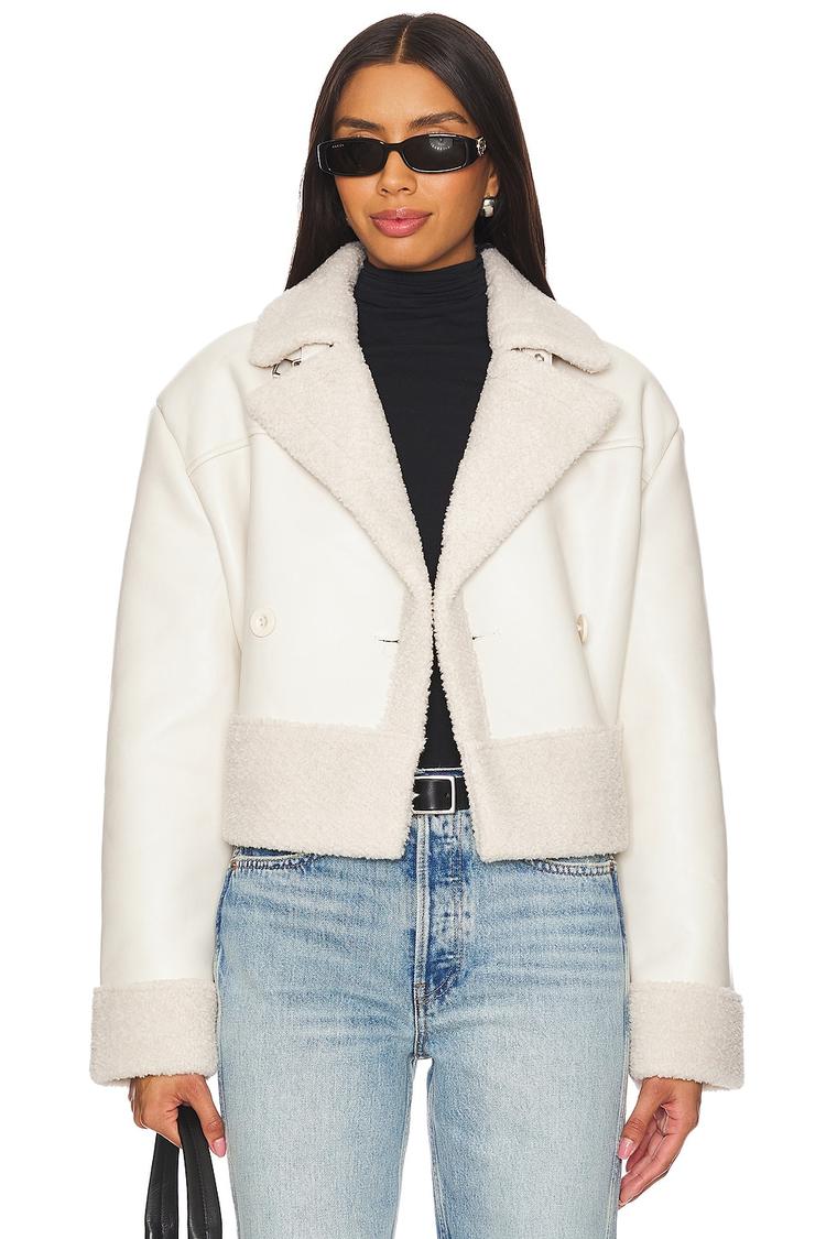This Steve Madden Athen Jacket is a chic double-breasted outerwear piece featuring a waist-length silhouette and a regular fit that complements everyday style. Crafted from faux leather with plush faux fur sherpa lining and trim, it offers cozy warmth and a textured contrast along the collar, cuffs, and hem. The jacket showcases classic lapels and long regular sleeves, secured with front buttons for a timeless look. Ideal for autumn and winter, it suits casual wear, streetwear, and workwear occasions with its minimalist and sophisticated design.