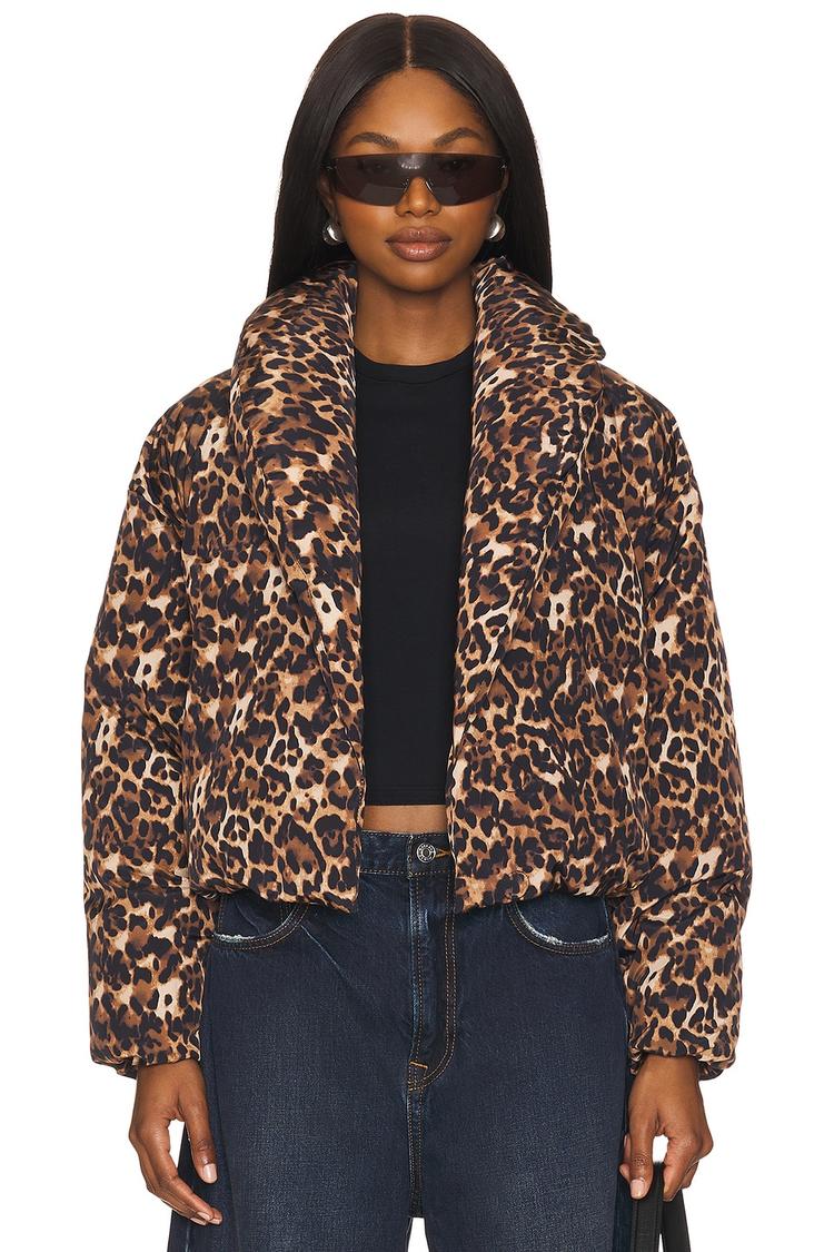 This Steve Madden Evy Jacket is a waist-length puffer-quilted outerwear piece featuring a bold all-over animal print in brown, black, and tan hues. Crafted from padded polyester ripstop fabric, it offers a regular fit with drop-shoulder long sleeves and a stand collar for added warmth. The jacket fastens with a single magnetized closure and includes practical side seam pockets. Perfect for casual, streetwear, and travel occasions in autumn and winter, this trendy jacket combines edgy style with functional design.