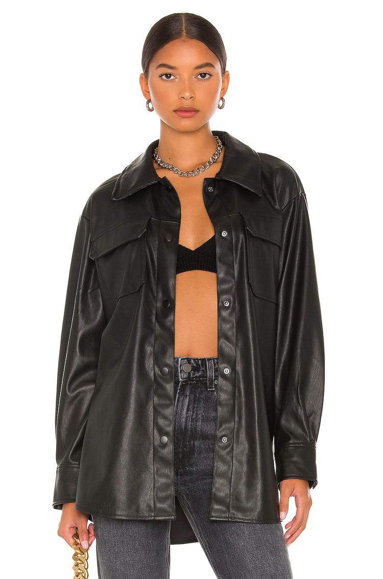 This matte black faux leather shacket features a relaxed fit and hip-length silhouette, perfect for layering in autumn and spring. It boasts a classic turn-down collar and long regular sleeves with buttoned cuffs. The front snap button closure and flap pockets add functional style, while the shirttail hem enhances its casual chic vibe. Crafted from smooth faux leather with a matte finish, this shacket suits casual, streetwear, and travel occasions with edgy modern appeal.