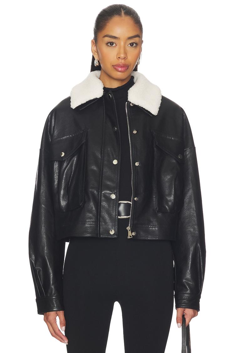 This blouson jacket features a sleek black faux leather body with a contrasting white faux shearling lined turn-down collar. It has a regular fit with long regular sleeves and a waist-length cut, complemented by snap button cuffs and front snap button and zipper closures. Deep front panel pockets add both style and functionality. The polyester lining ensures comfort and warmth, making it a versatile choice for casual, streetwear, and travel occasions during autumn, winter, and spring seasons.
