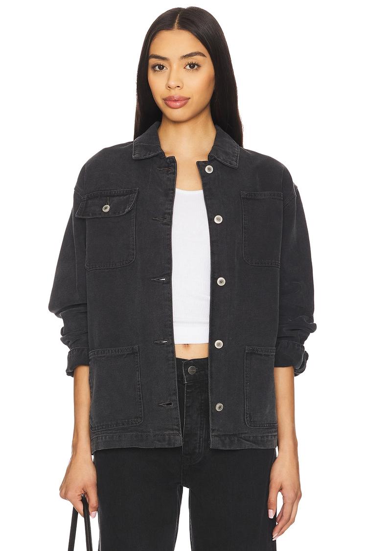 This Estella jacket by superdown is a hip-length utility piece crafted from a rigid cotton and lyocell blend canvas fabric. Featuring a loose fit and a band collar neckline, it fastens with front silver-tone buttons and includes four patch pockets adding practical style. The long regular sleeves and covered back contribute to its classic and minimalist appeal, making it ideal for casual, streetwear, and workwear occasions during spring and autumn. Its solid matte black color and subtle silver button details offer timeless versatility in your outerwear collection.