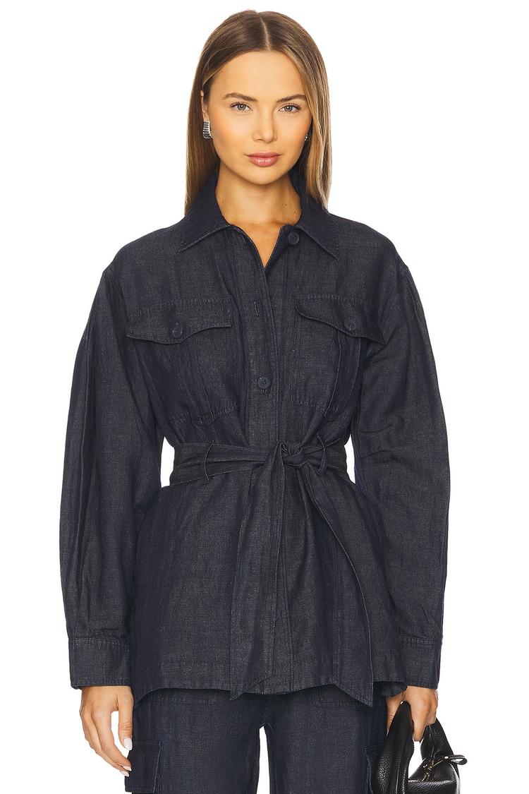This Utility jacket features a hip-length silhouette crafted from a lightweight rigid denim linen blend in a rich dark blue hue. It includes a classic turn-down collar, long regular sleeves, and two front patch flap pockets with button closures, adding functional style. The belted waist tie defines the fit, offering a regular, flattering shape. The jacket is unlined with a polyester-spandex lining for comfort and flexibility. Perfect for casual outings, workwear, and travel, this minimalist, casual chic piece blends utility with effortless style for transitional seasons.