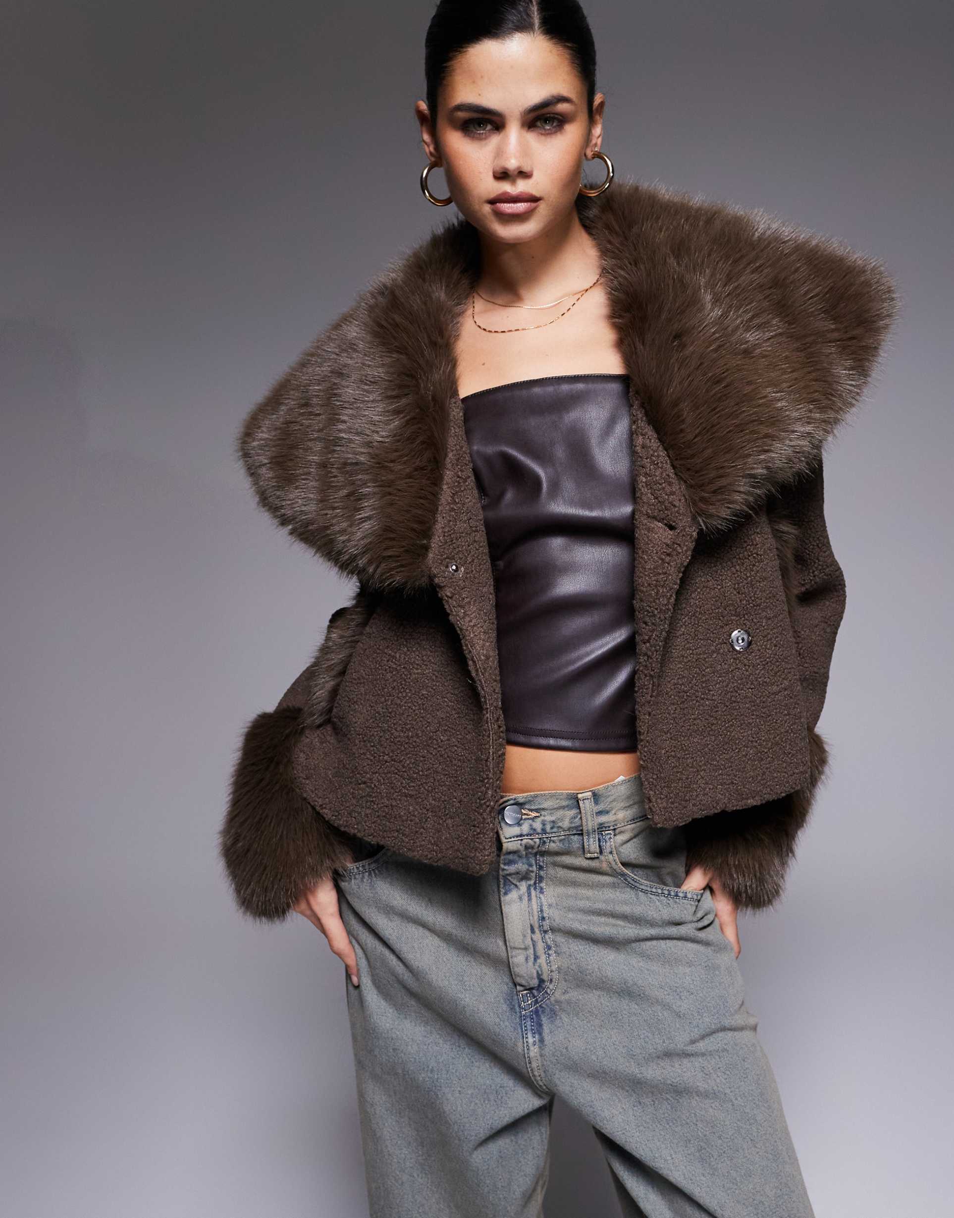 THE FROLIC EXCLUSIVE BOUCLÉ FAUX FUR OVERSIZED COLLAR AND CUFF DETAILING JACKET IN CHOCOLATE