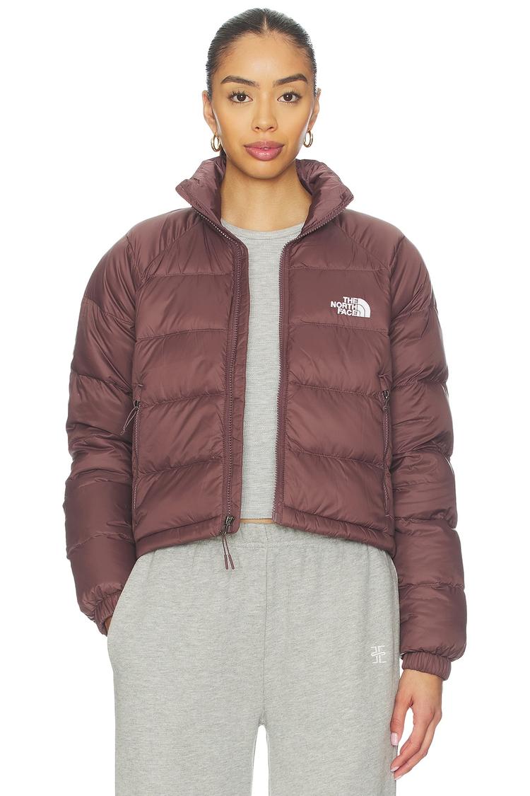 This North Face Hydrenalite Down Jacket features a matte dark burgundy puffer-quilted design with a regular fit and waist-length cut. It has a stand collar and long regular sleeves with elastic cuffs for added comfort. Made from nylon and polyester with quilted fabric treatment, the jacket includes zipper pockets and an adjustable hem drawcord for functional styling. Its solid color and all-over quilting deliver a sporty chic look ideal for casual wear, travel, and outdoor events in autumn and winter.