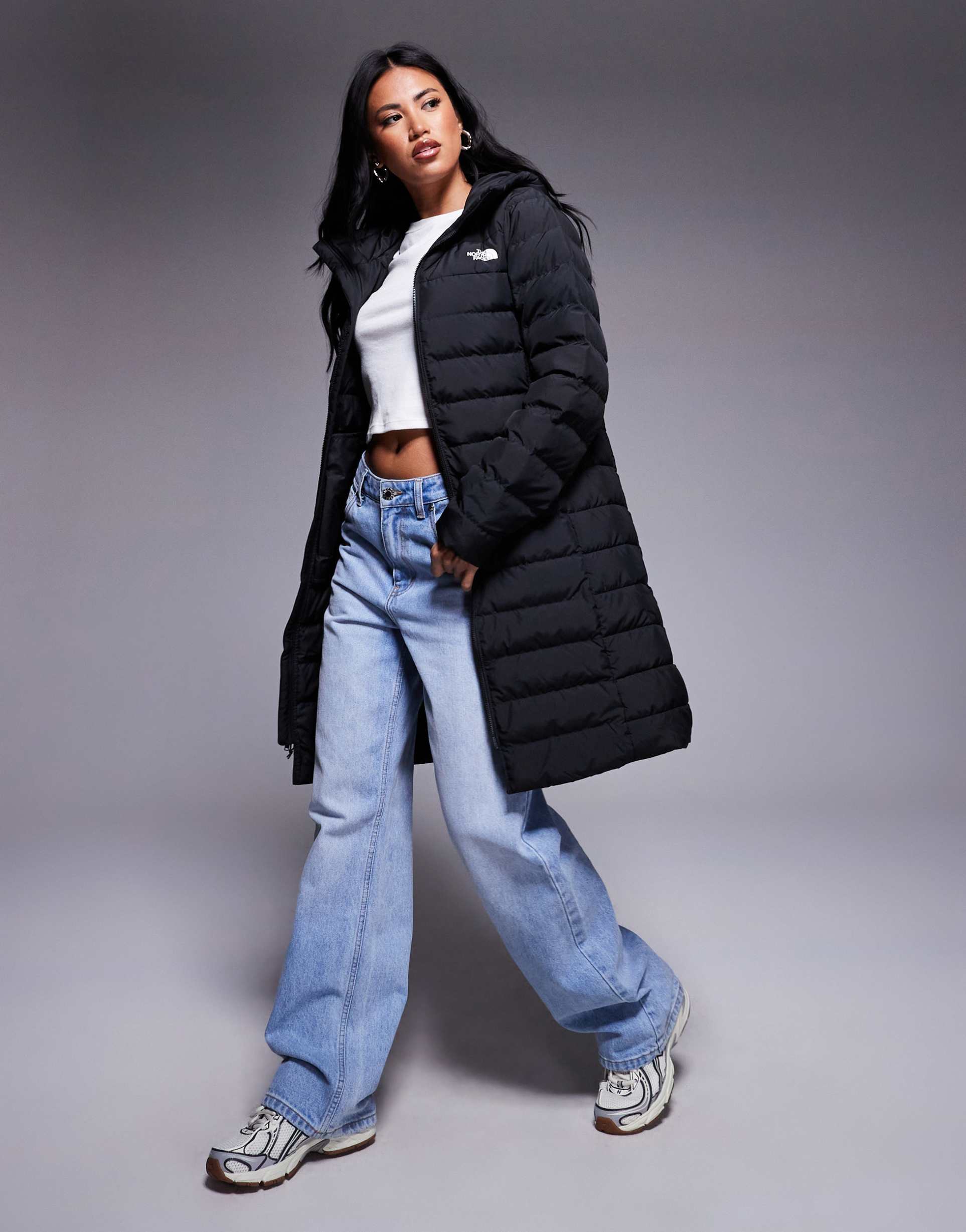 This longline black parka from The North Face features a fixed hood and a high collar for added warmth and protection against the cold. Crafted from durable polyester fabric, it offers a regular fit with long sleeves and a front zipper closure. Practical side pockets enhance functionality, making it ideal for casual wear, travel, or everyday workwear during autumn and winter seasons. The classic sporty chic design ensures you stay stylish while comfortably layered in cooler weather.