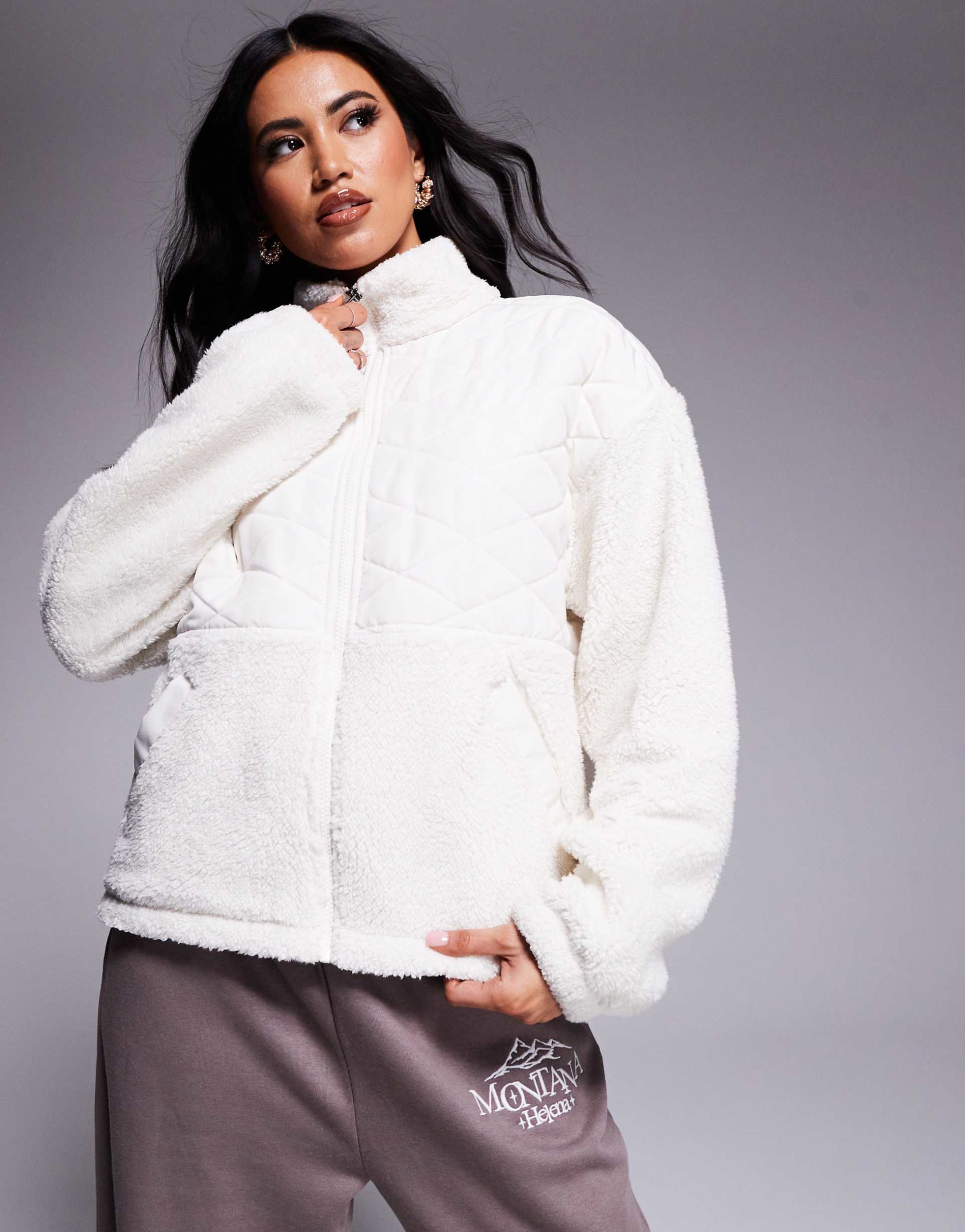 This North Face Cabin Fleece jacket features a cozy cream fleece fabric with a soft, insulating texture perfect for autumn and winter seasons. Designed in a regular fit blouson style, it offers a waist-length cut with long sleeves and a high neck collar for added warmth. The jacket closes with a front zipper and includes practical side pockets. Subtle logo embroidery at the hem adds a refined detail to this casual chic piece, ideal for casual wear, travel, and loungewear during cooler days.