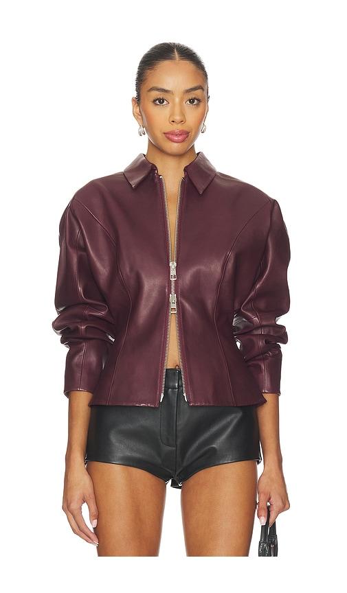 THE SEI FITTED LEATHER JACKET IN BURGUNDY.