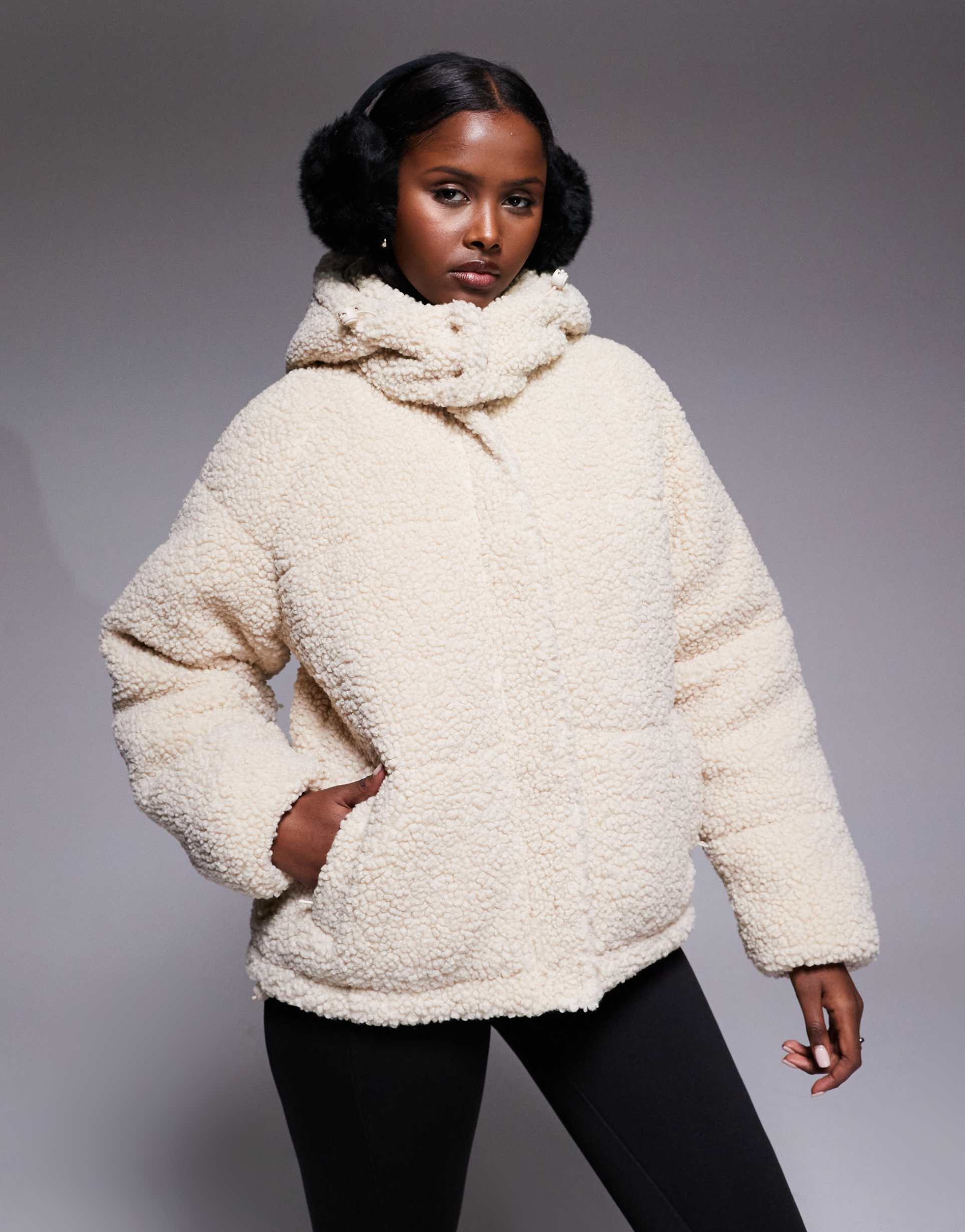 THREADBARE SKI SHORT FAUX SHEARLING PUFFER JACKET WITH HOOD IN CREAM
