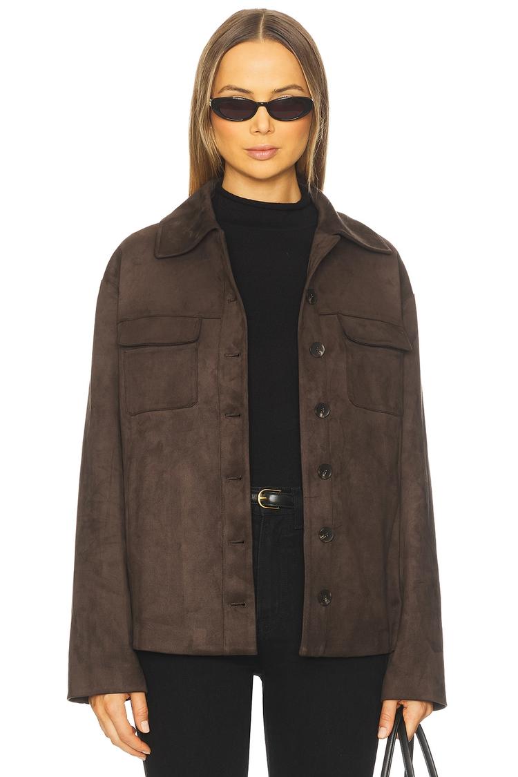This Irene Faux Suede Jacket by Tularosa offers a timeless Utility style in a matte dark brown faux suede fabric. Featuring a regular fit and hip-length cut, it is fully lined with polyester and viscose for comfort. The jacket has a classic turn-down collar, long regular sleeves, and button-front closure. Functional patch pockets adorn the front, adding practical style. Its solid color and minimalist design make it ideal for casual, business casual, and workwear occasions during autumn, winter, and spring.