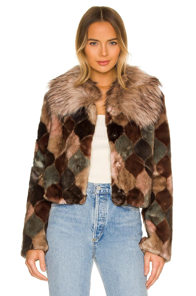 This chic blouson jacket features a waist-length silhouette with a relaxed regular fit, crafted from soft faux fur in a diamond patchwork pattern of matte brown, dark brown, taupe, and black hues. The turn-down collar is accentuated with plush faux fur trim, adding texture and warmth. Long regular sleeves complement the cozy design, while a discreet hook and eye closure ensures a clean front. Fully lined with a polyester-elastane blend, this jacket suits autumn and winter wear. Perfect for casual outings, streetwear vibes, or stylish night events, it offers trendy warmth and sophisticated texture.