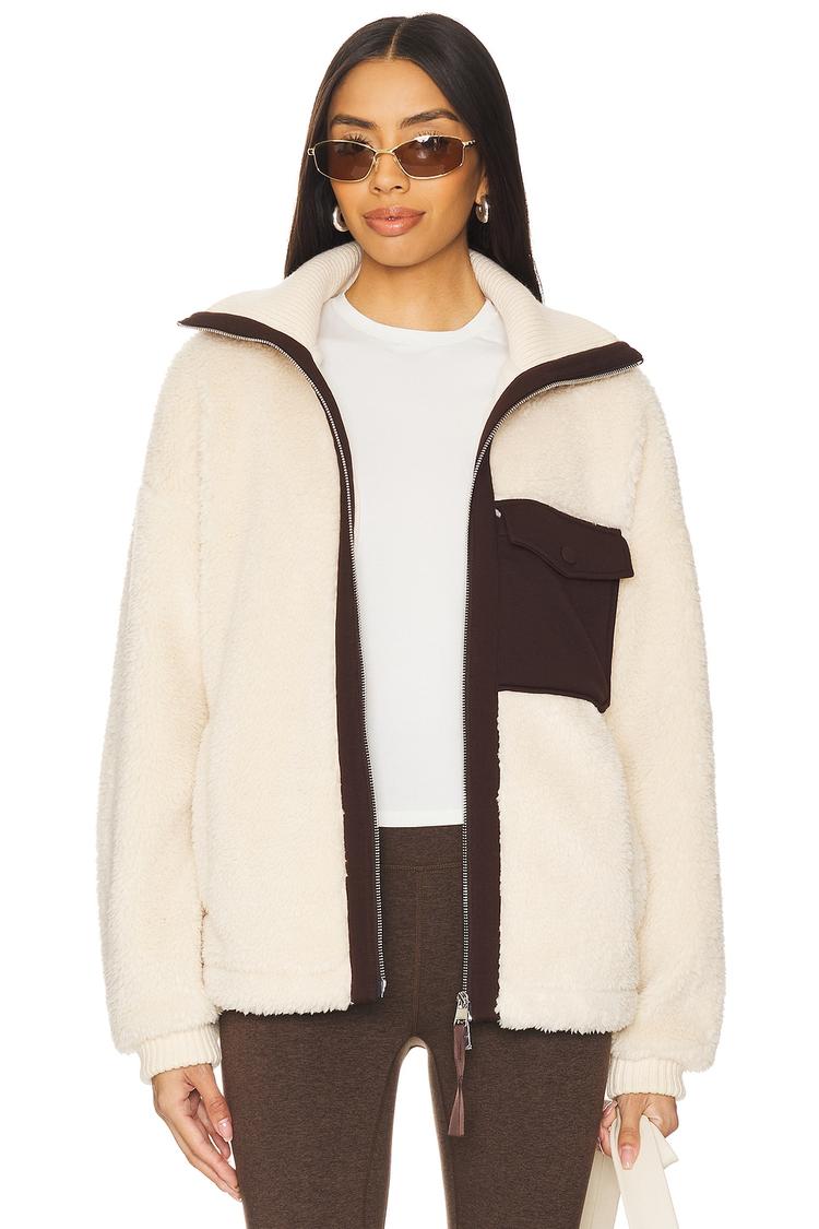 This hip-length blouson jacket features a relaxed fit crafted from cozy sherpa fabric in off-white with contrasting brown accents on the stand collar, exposed front zipper, and large breast pouch pocket. Long regular sleeves complement the casual chic and sporty vibe, while the drawstring at the hem and zipper pockets add functional appeal. Lined with a cotton-polyester blend for comfort, this sherpa jacket is perfect for autumn and winter casual wear, street style looks, or travel layering.