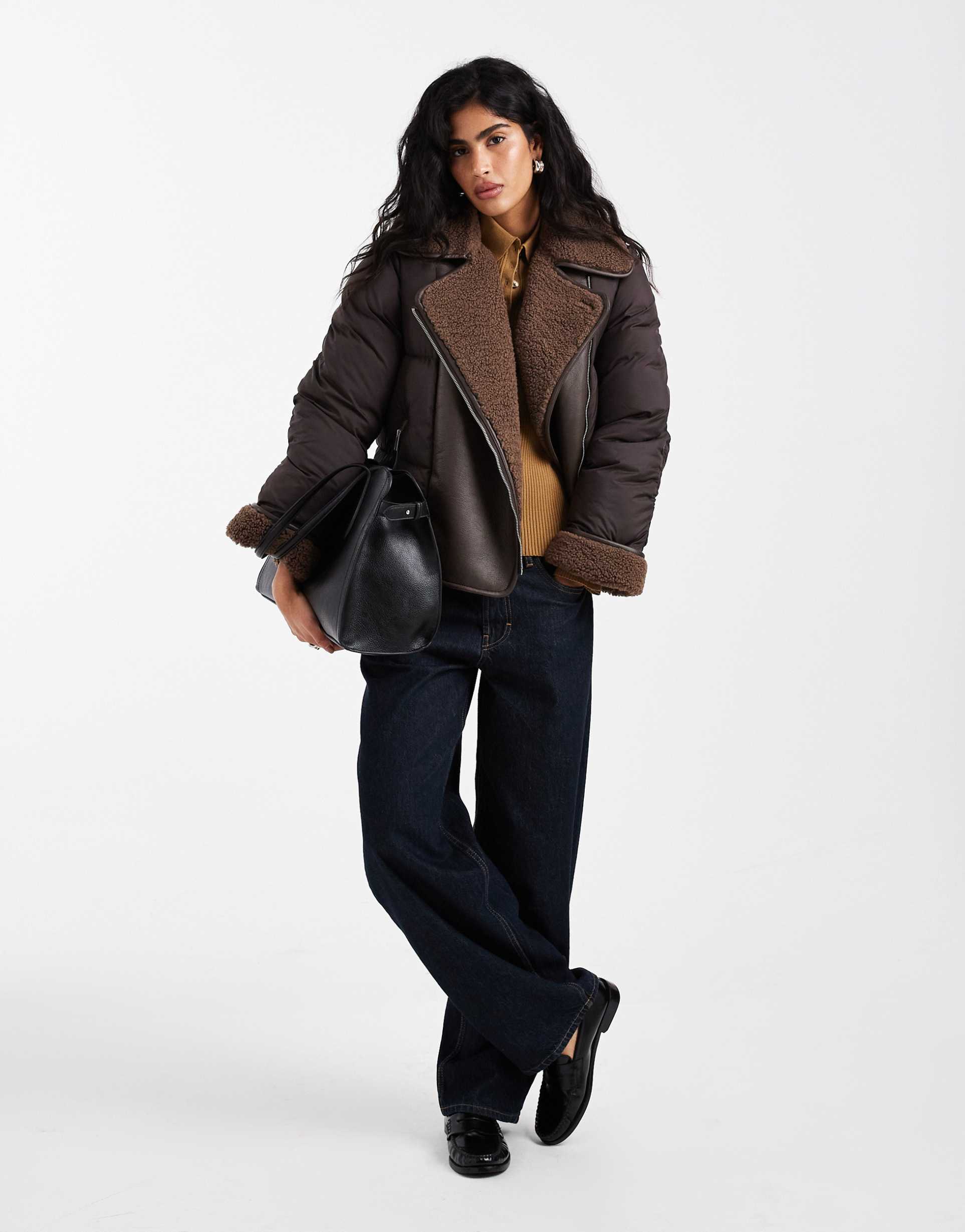 VERO MODA MIXED TEXTILE SHORT PUFFER JACKET WITH BORG TRIM IN CHOCOLATE