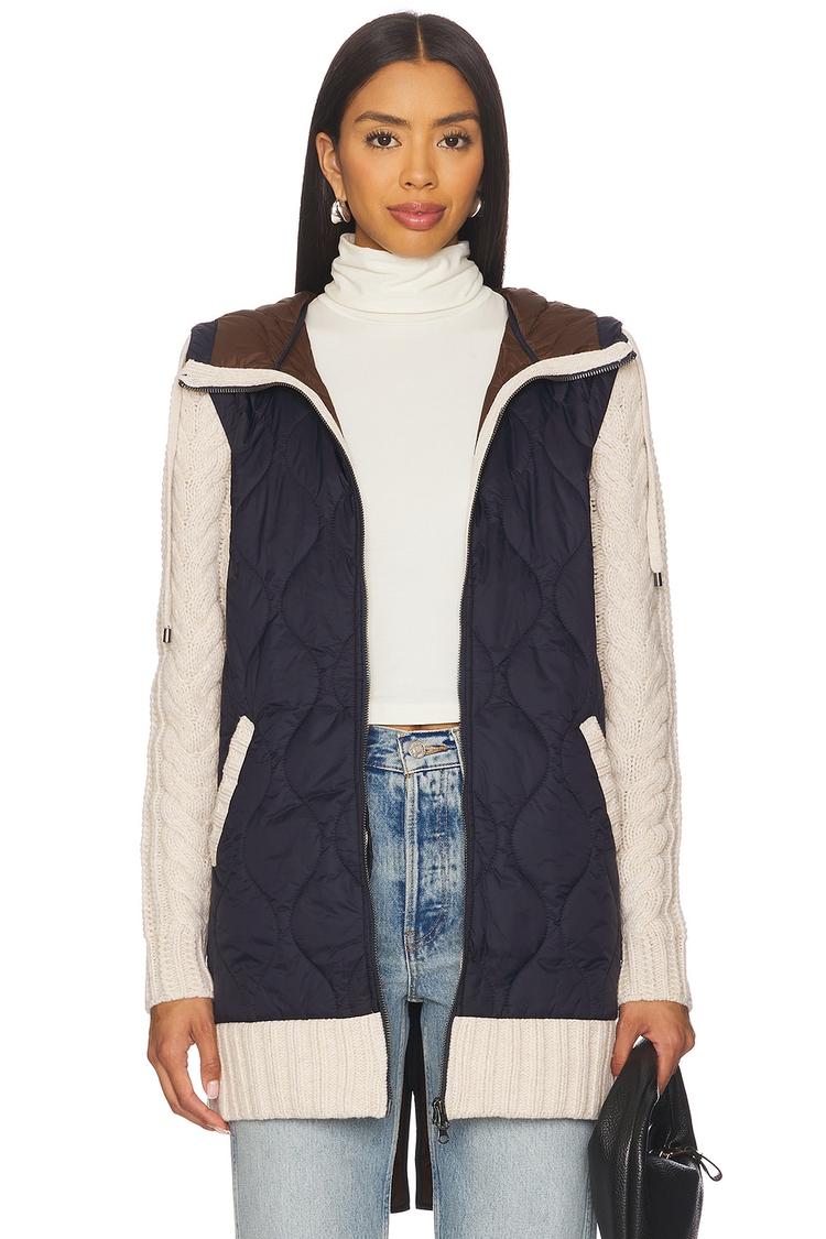 This hip-length mixed media puffer-quilted jacket combines a matte navy nylon front with textured cream wool sleeves and hem for a modern casual chic look. Featuring a hooded neckline with drawstring, long regular sleeves, and front slip pockets, it offers practical warmth and style for autumn and winter. The exposed front zipper closure and quilted detailing on front and back add dimension to the regular fit silhouette. Ideal for casual outings, travel, and streetwear, this jacket blends functional features with soft texture contrasts for versatile layering.
