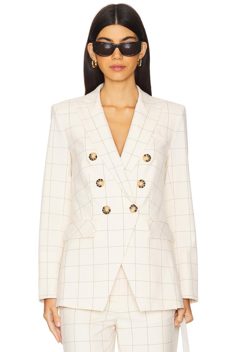 This double-breasted blazer features a tailored fit with a hip-length cut, perfect for polished workwear or business casual settings. Crafted from a polyester-viscose twill fabric, it showcases a classic notch lapel neckline and long regular sleeves. The checkered pattern in taupe on an off-white base adds subtle sophistication, while padded shoulders and epaulettes enhance the structured silhouette. Functional front flap and breast pockets, along with buttoned cuffs, offer practical style. Fully lined with polyester, this blazer balances elegance and comfort for autumn, winter, and spring seasons, ideal for conferences and professional occasions.