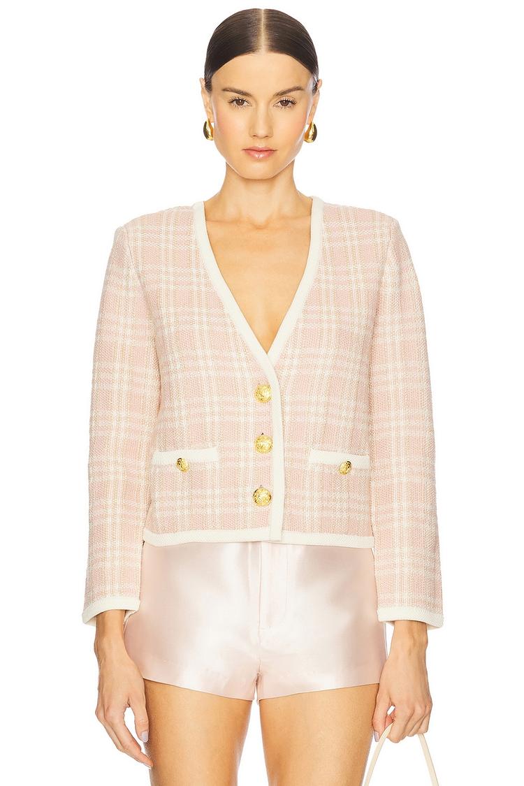 This Veronica Beard Claudine Knit Jacket features a tailored single-breasted silhouette in a textured, lightweight knit fabric with a soft checkered pattern in light pink and white. The jacket is hip-length with long regular sleeves and a flattering V-neckline. Gold-tone hardware buttons and front buttoned pockets add elegant detailing, complemented by subtle padded shoulders enhancing its classic chic style. Perfect for business casual settings, conferences, and casual outings in spring or autumn, this knit jacket blends timeless sophistication with modern comfort.
