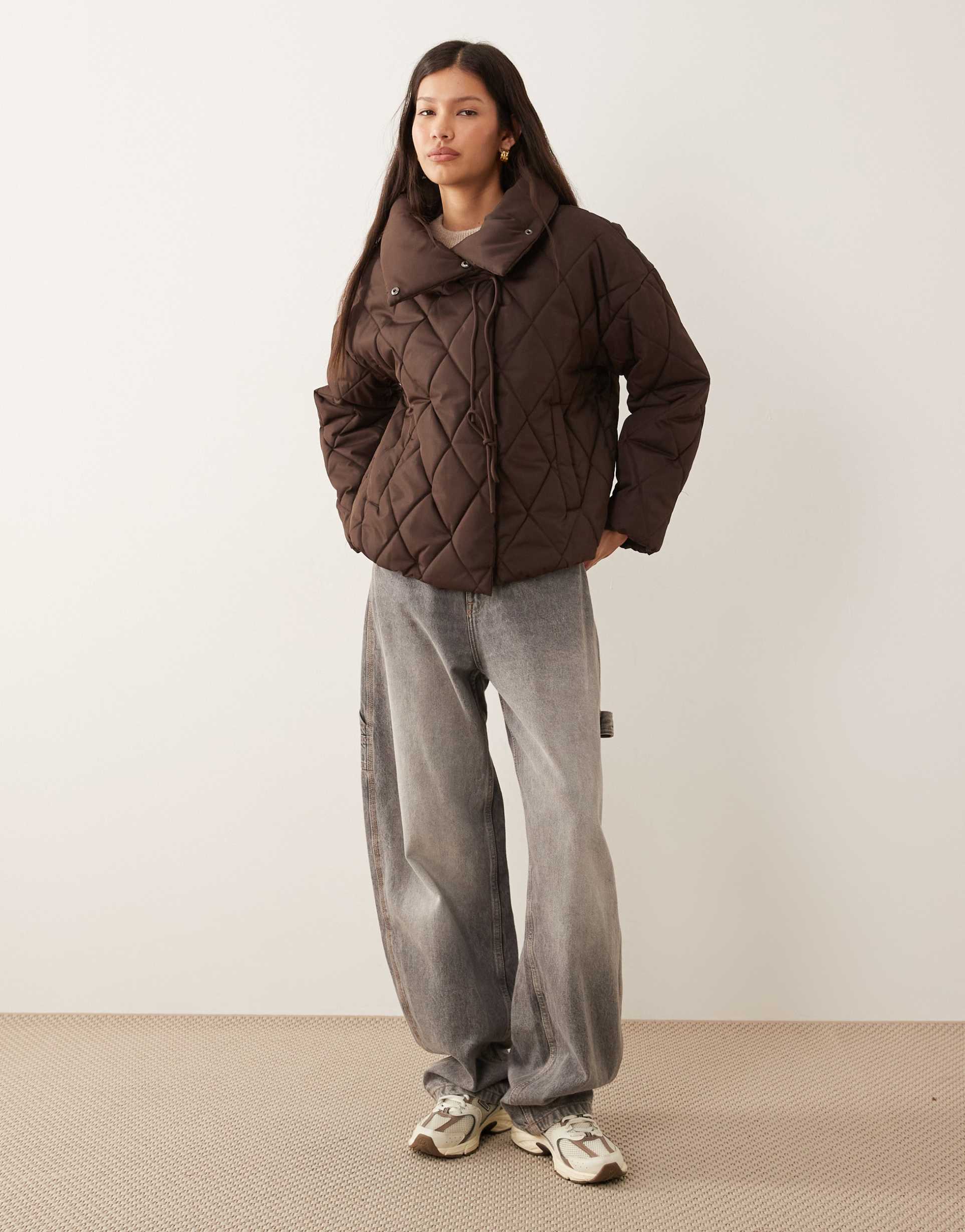 VILA HIGH NECK QUILTED JACKET WITH TIE DETAILS IN CHOCOLATE BROWN