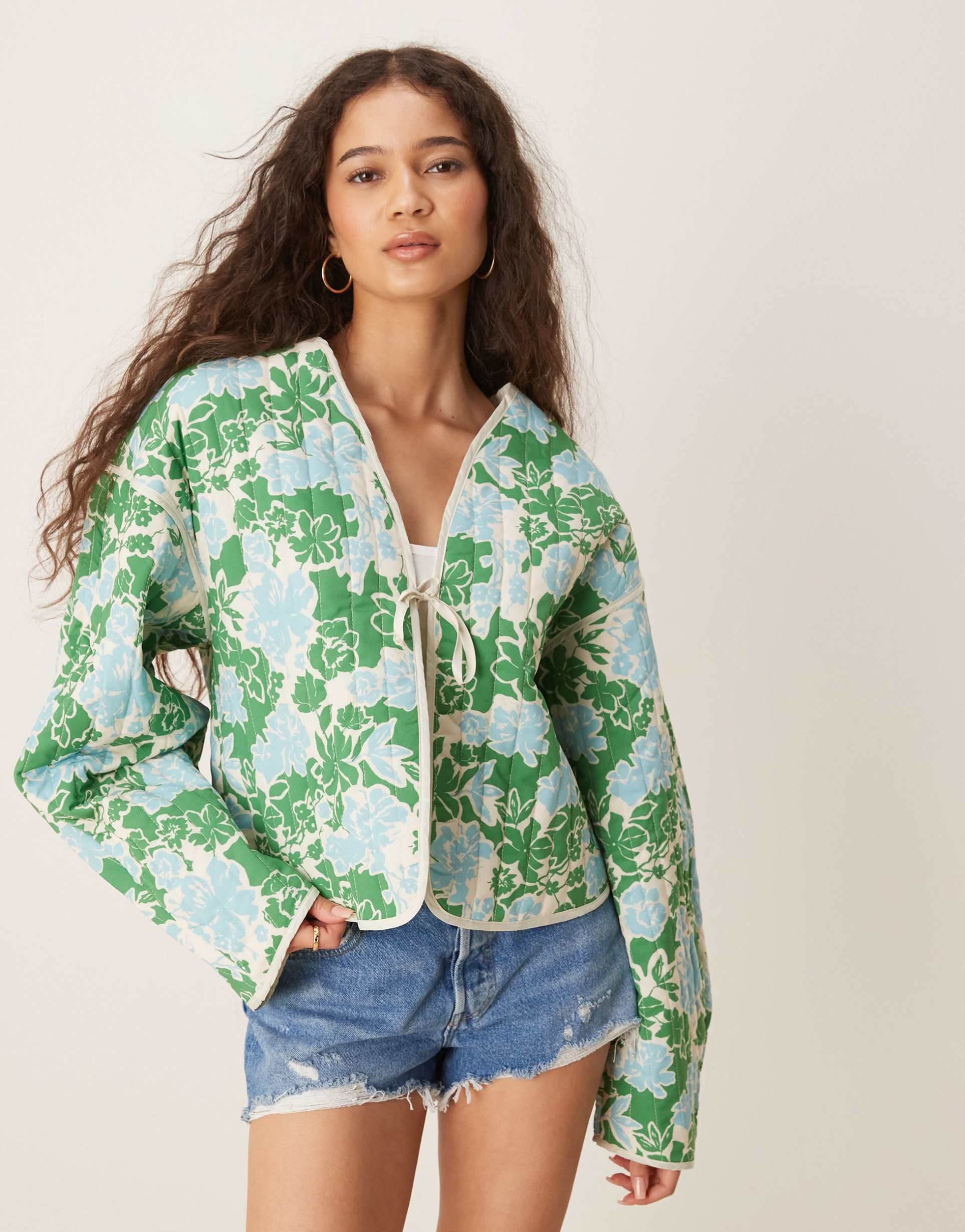 VILA TIE FRONT QUILTED JACKET IN BLUE AND GREEN FLORAL