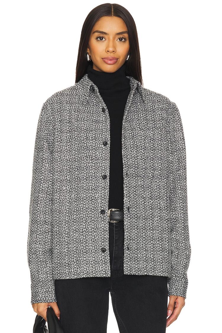 This classic bouclé tweed shacket features a hip-length relaxed fit with a timeless turn-down collar and long regular sleeves finished with button cuffs. Crafted from a midweight polyester-wool blend with a polyester-viscose lining, it offers textured sophistication through its black and white checkered pattern worn all over. The front button closure and chest slip pocket provide practical functionality, making it perfect for casual days, business casual environments, or stylish autumn and spring layering. Its minimalist chic style and cozy fabric make it a versatile piece for workwear and everyday use.