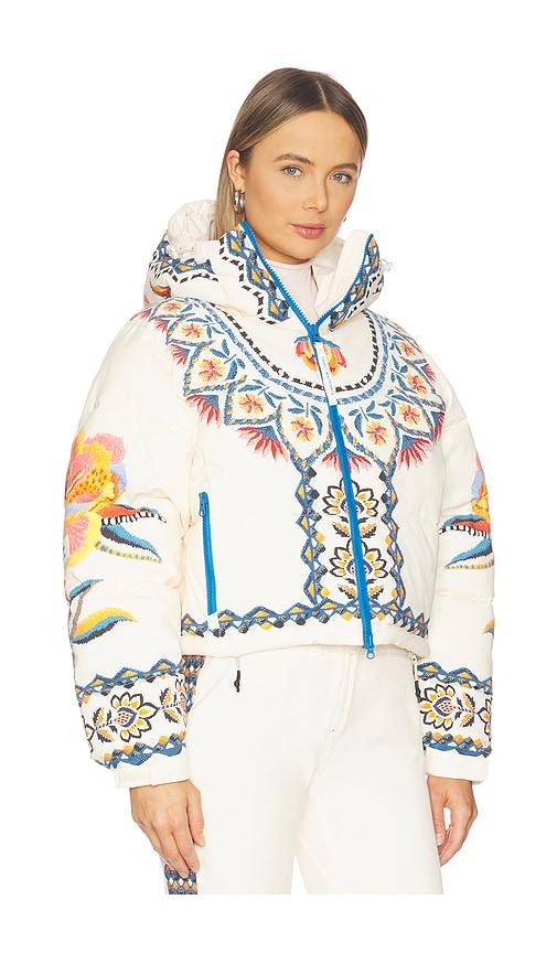 WHITESPACE X FARM RIO CROPPED PUFFER JACKET IN CREAM.