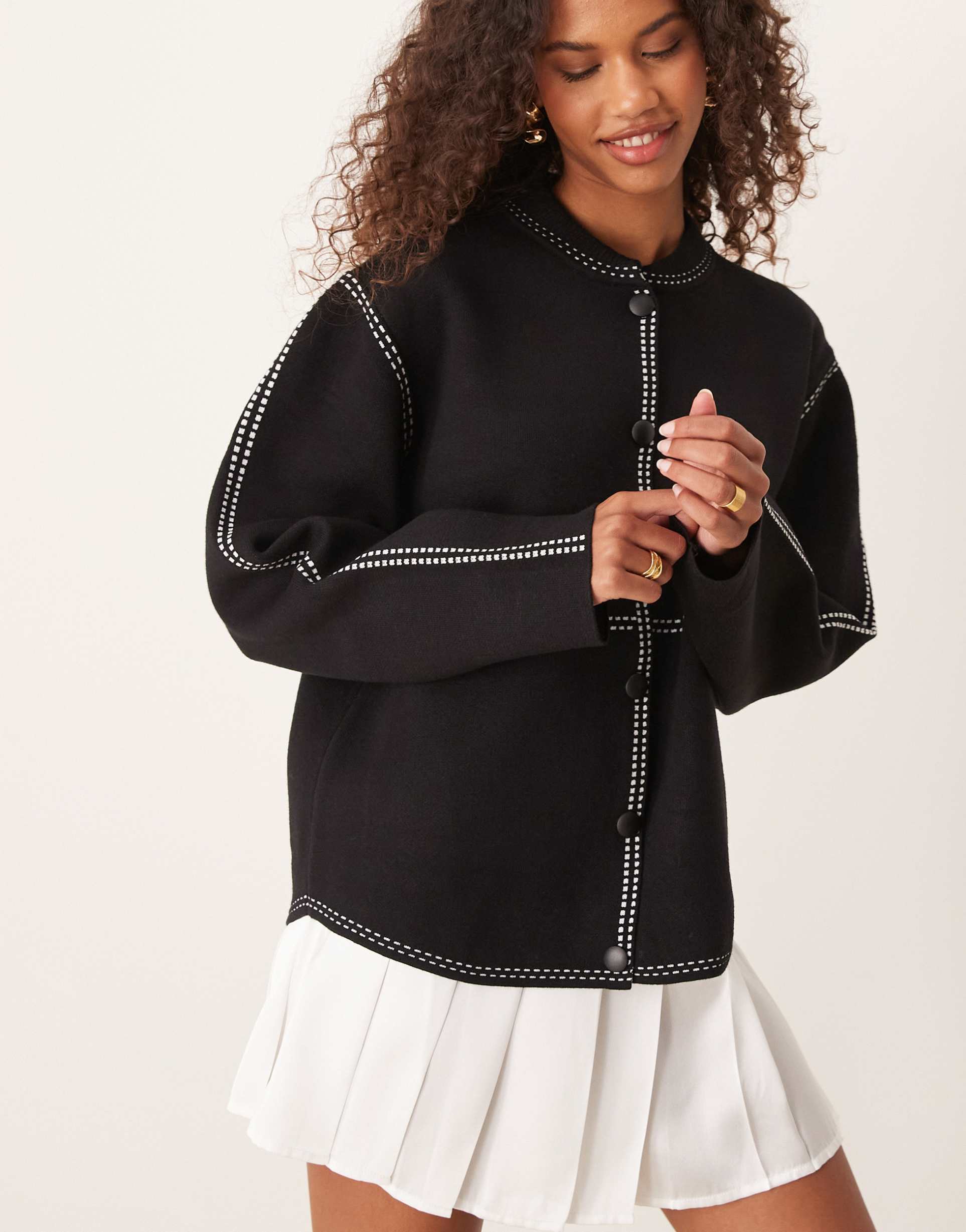 YAS CONTRAST STITCH KNIT BOMBER JACKET IN BLACK