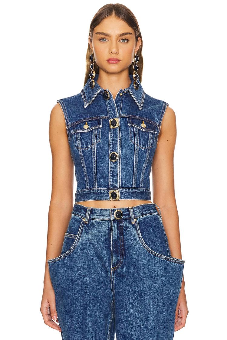 This cropped denim vest features a fitted silhouette with a classic turn-down collar and sleeveless styling, crafted from 100% cotton denim fabric. The front snap button closure is adorned with striking gemstone buttons, adding a chic and modern touch. Practical breast flap pockets enhance the casual yet polished look. Ideal for casual outings, streetwear ensembles, or brunch dates during spring, summer, and autumn seasons, this vest pairs effortlessly with high-waisted denim or trousers for a trendy layered effect.
