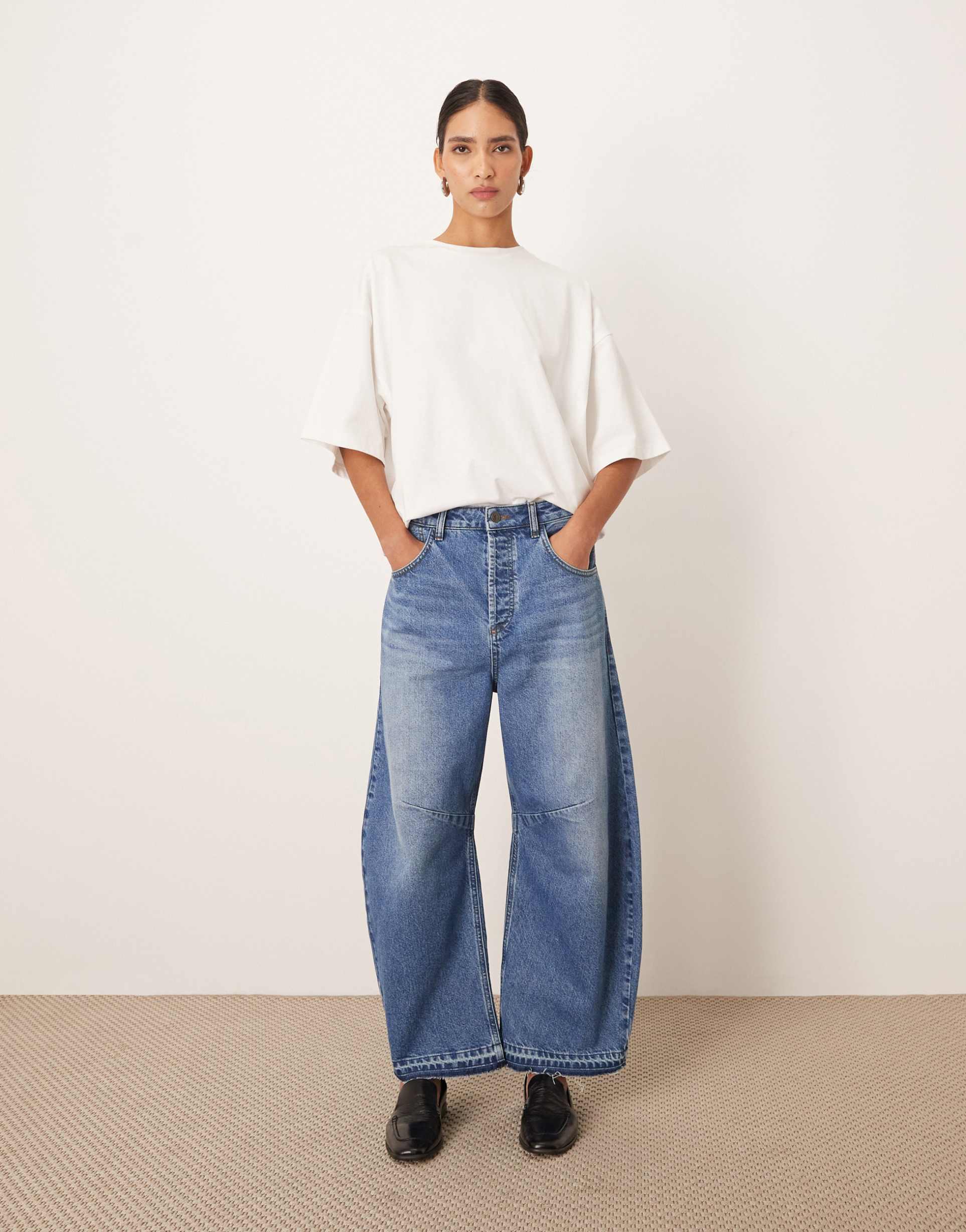ARRANGE SYDNEY RELEASED HEM CROPPED JEANS IN MID WASH BLUE
