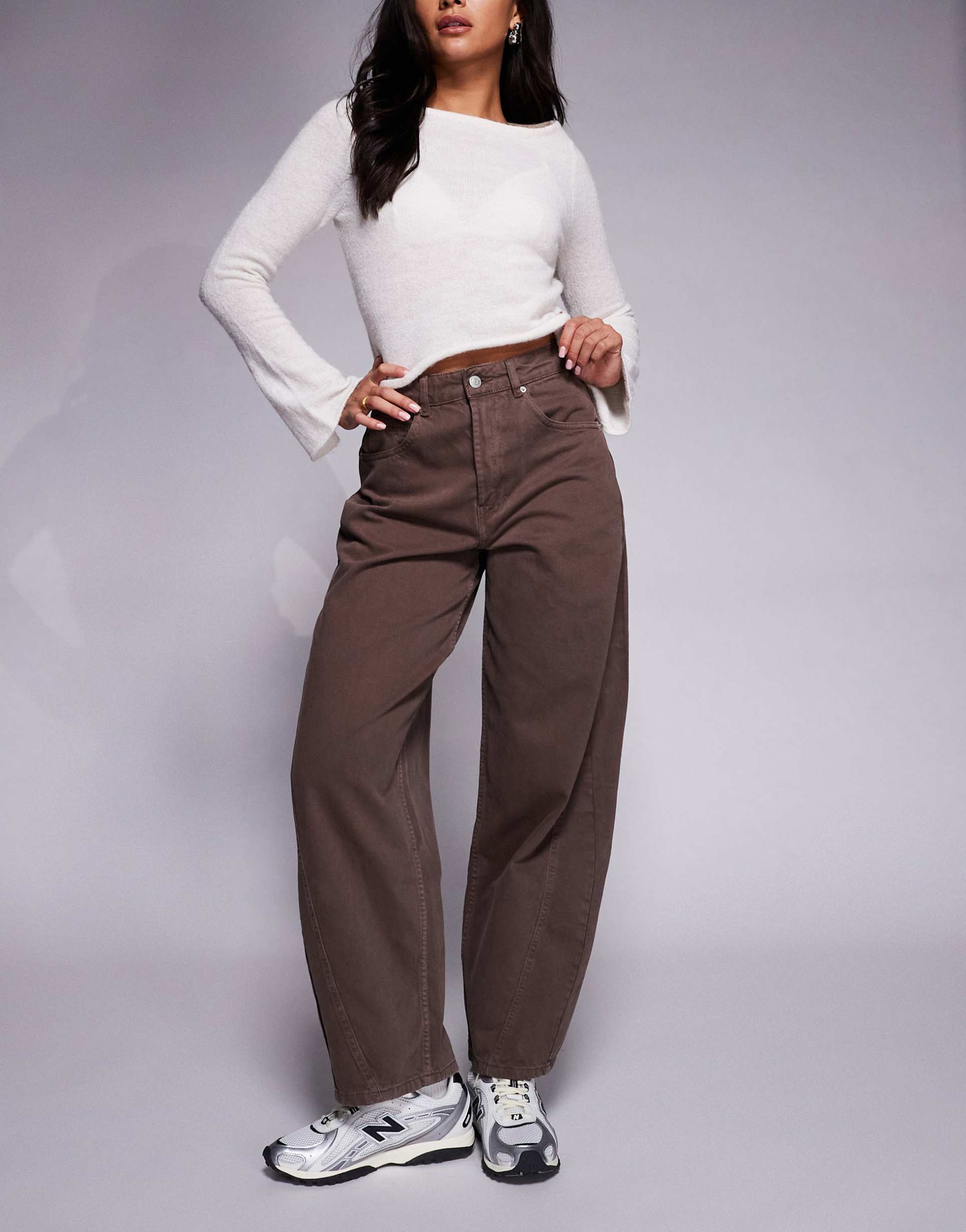 ASOS DESIGN BARREL LEG JEANS WITH PANELING AND CINCHED WAIST IN WASHED BROWN