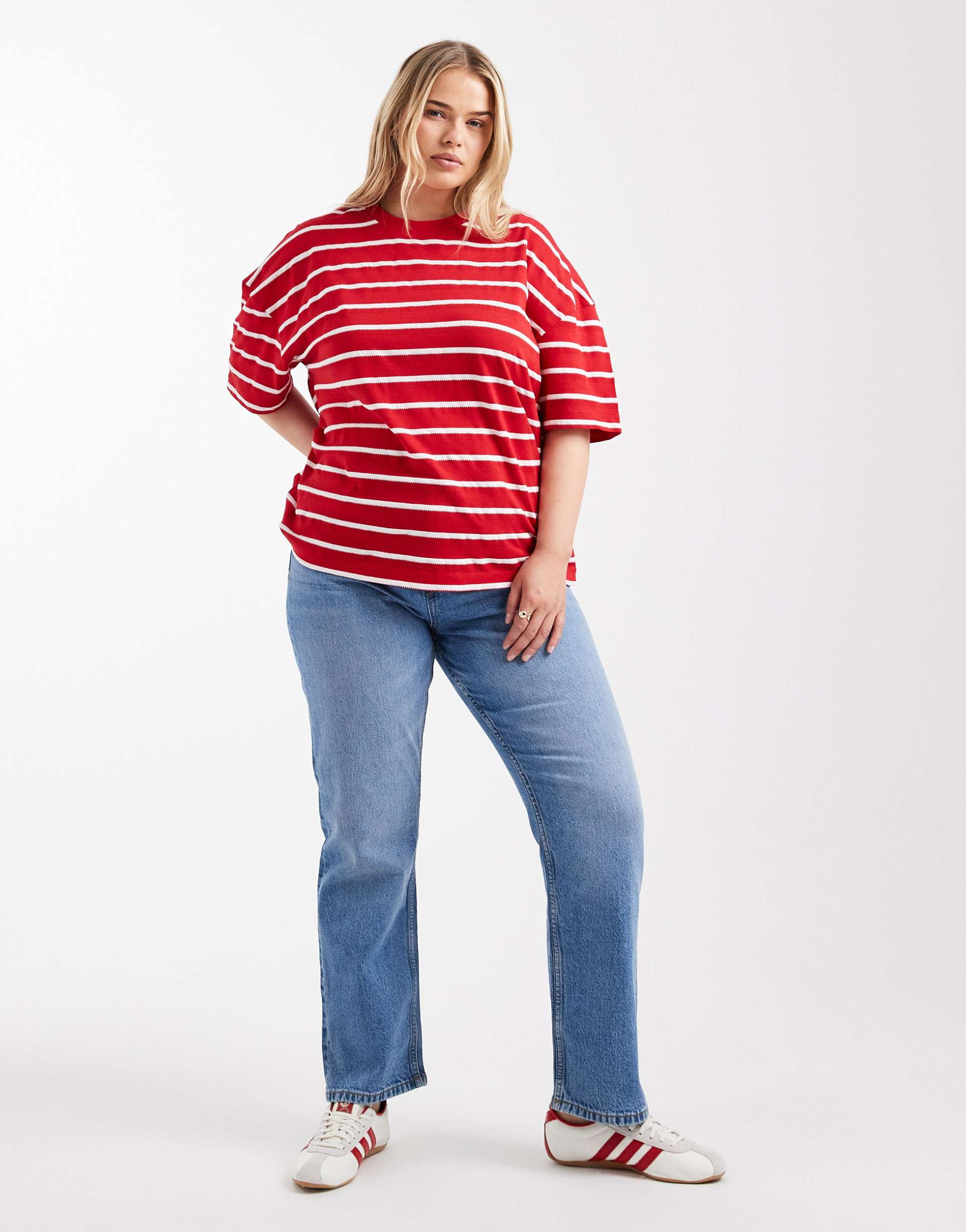 Discover the perfect blend of comfort and timeless style with these ASOS DESIGN Curve high-rise slim straight jeans in a versatile mid-blue wash. Crafted from a cotton-elastane blend, these jeans offer a slight stretch for ease of movement while maintaining a structured silhouette. The high-rise waist and flat-front waistband ensure a flattering fit, complemented by classic belt loops and five functional pockets. Their clean hemline and slim fit create a sleek profile ideal for everyday wear. These jeans are your go-to choice for casual outings, effortlessly pairing with any top for a chic, comfortable look.
