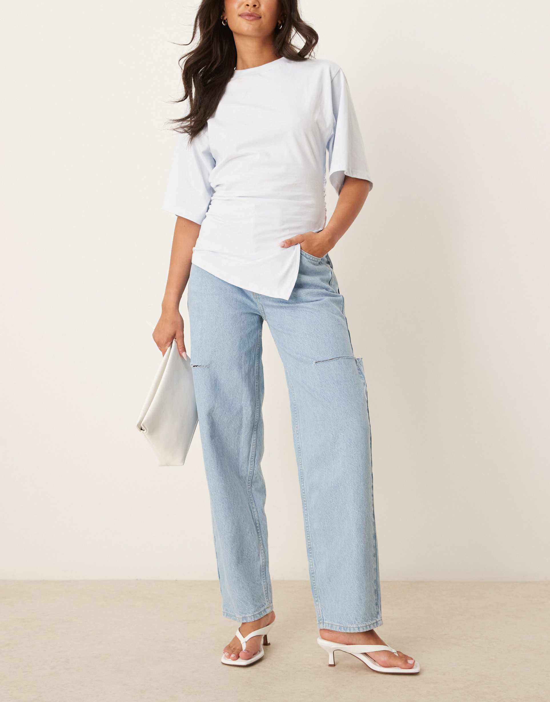 Embrace a relaxed yet stylish vibe with these ASOS DESIGN high waist barrel jeans in a light wash denim. Crafted from 100% cotton non-stretch denim, these jeans feature a balloon fit with a high waist and clean flat-front waistband. The standout thigh slits add a trendy, edgy touch to the classic solid light blue fabric. Complete with belt loops and five functional pockets, these full-length wide-leg jeans offer comfort and practicality. Perfect for casual outings or streetwear looks in spring through autumn, they bring effortless modern style to your everyday wardrobe.