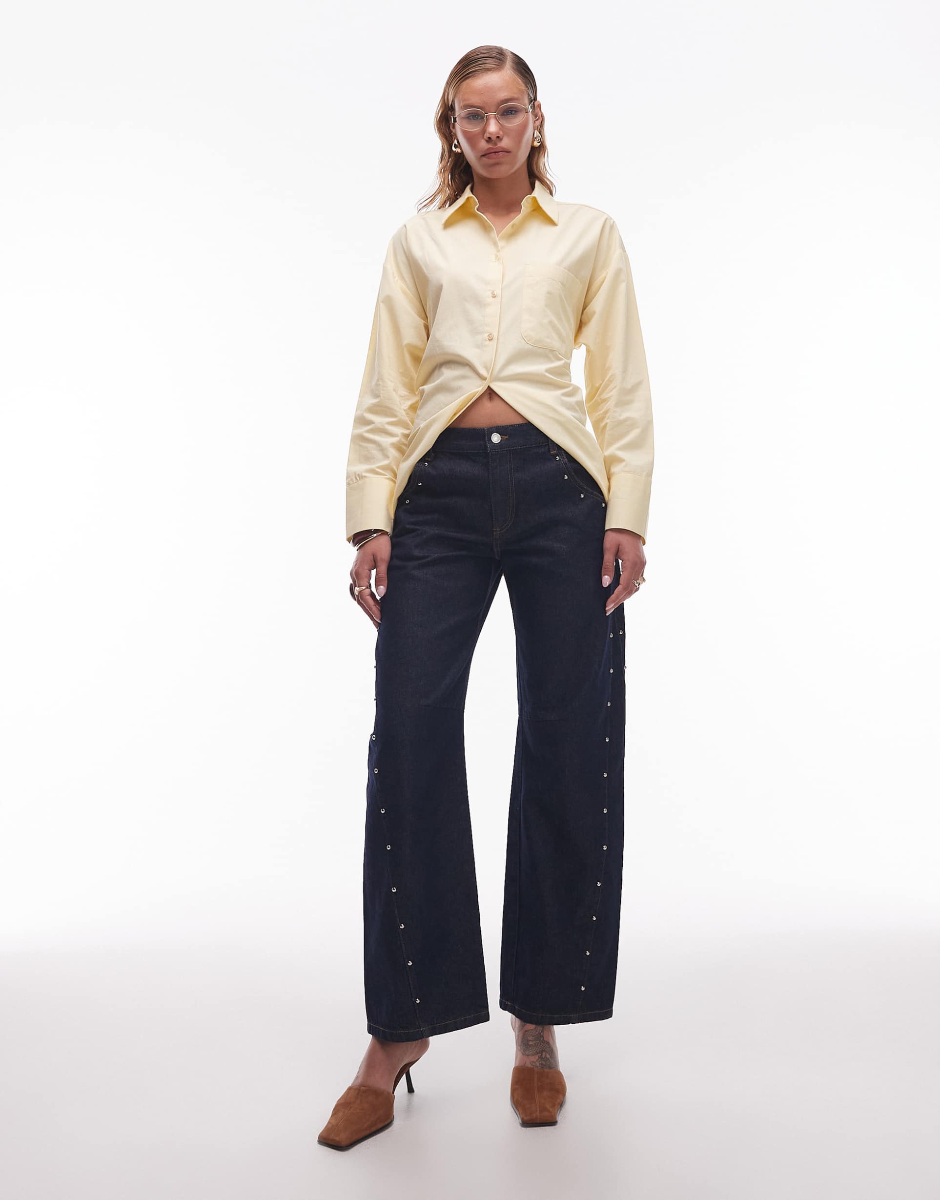 ASOS DESIGN LOW RISE BARREL LEG STUDDED JEANS IN INDIGO
