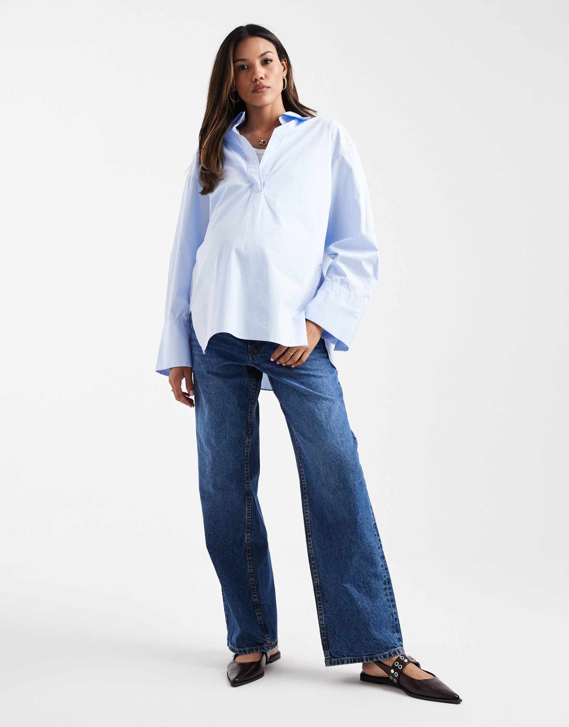 Experience comfort and style throughout your pregnancy with these ASOS DESIGN maternity baggy jeans in a rich dark blue wash. Crafted from 100% cotton denim, these jeans feature a relaxed, loose fit that flatters every bump, complemented by a stretch-jersey bump band for adjustable support. The regular rise and belted waistband with functional belt loops ensure a secure fit, while practical pockets add everyday convenience. Their full-length silhouette and clean hemline make them a versatile staple for casual, everyday wear, effortlessly blending maternity needs with modern denim style.