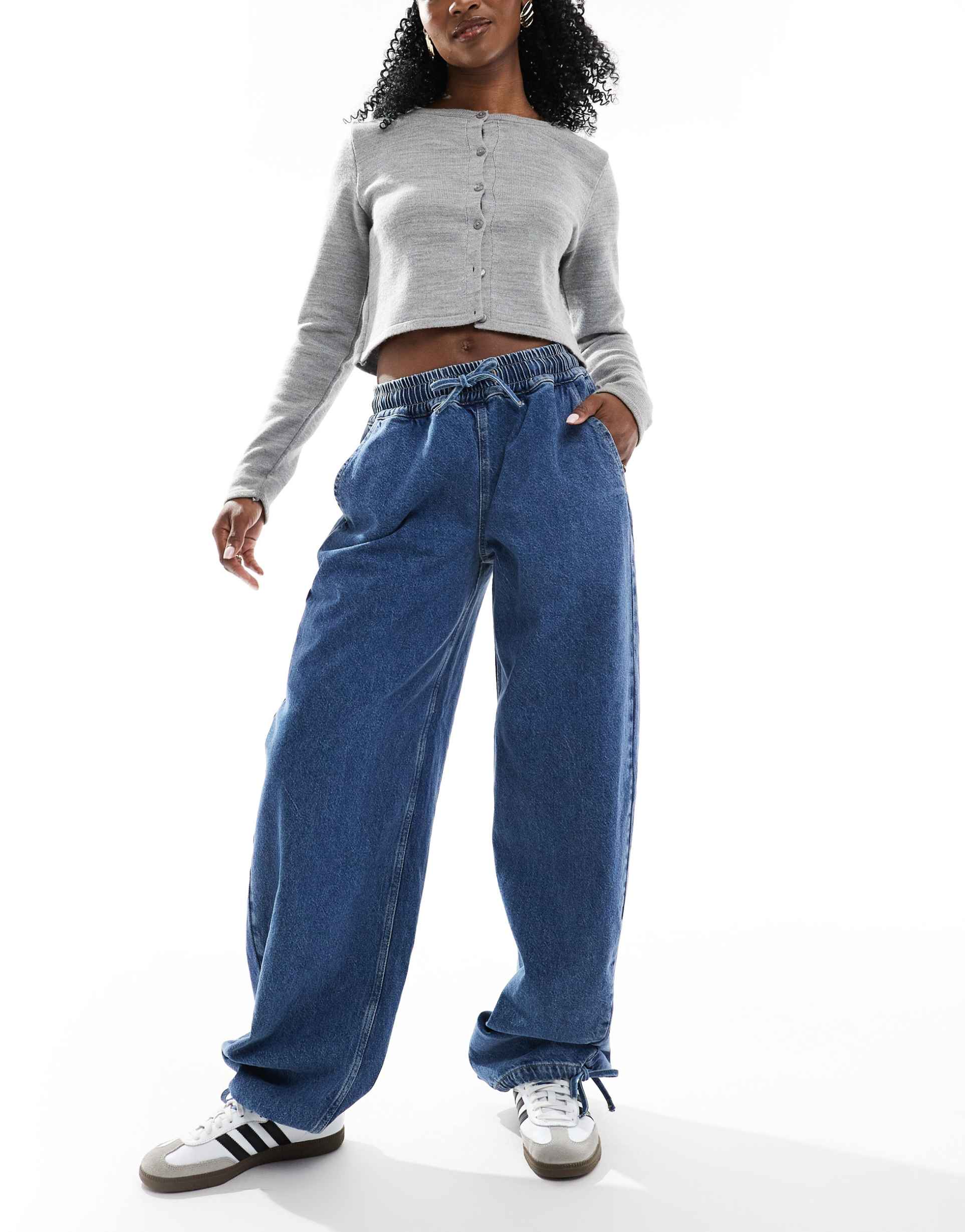 ASOS DESIGN PULL ON BARREL LEG JEANS WITH TIE WAIST IN LIGHT MID BLUE