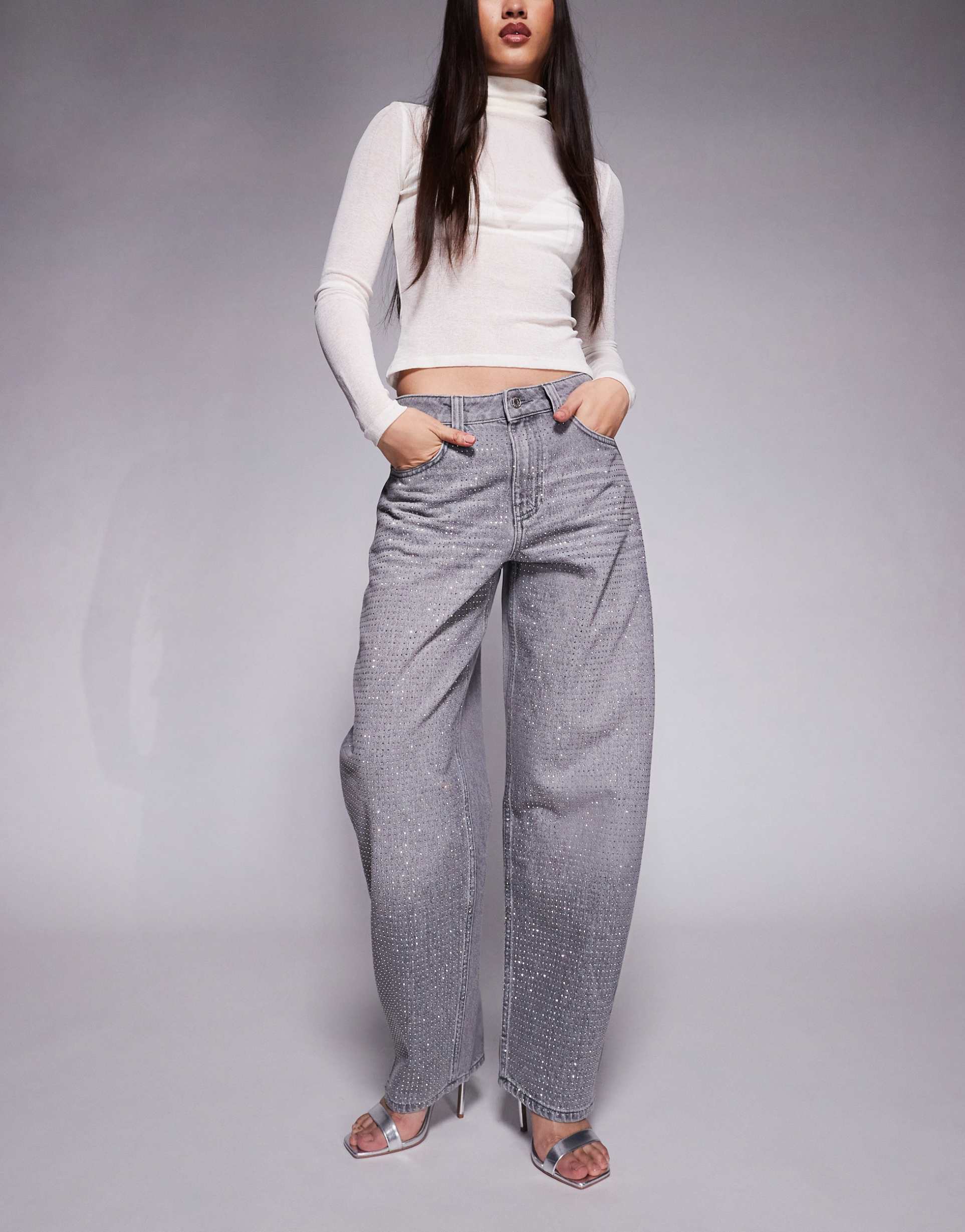 ASOS DESIGN SLIM BARREL JEANS IN GRAY WITH DIAMANTE EMBELLISHED FRONT
