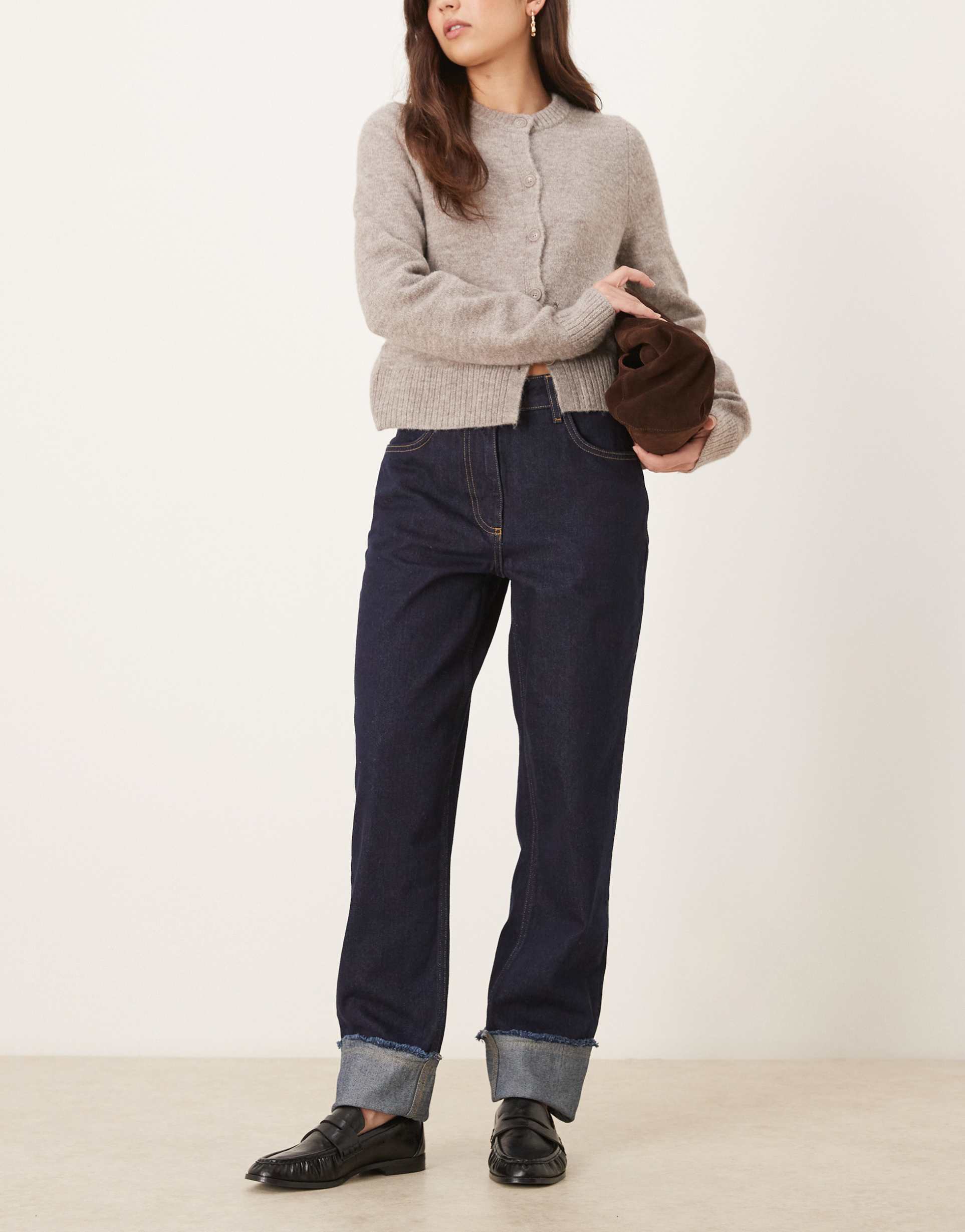 ASOS DESIGN TURN-UP DAD JEANS WITH DISTRESSED CUFF IN INDIGO