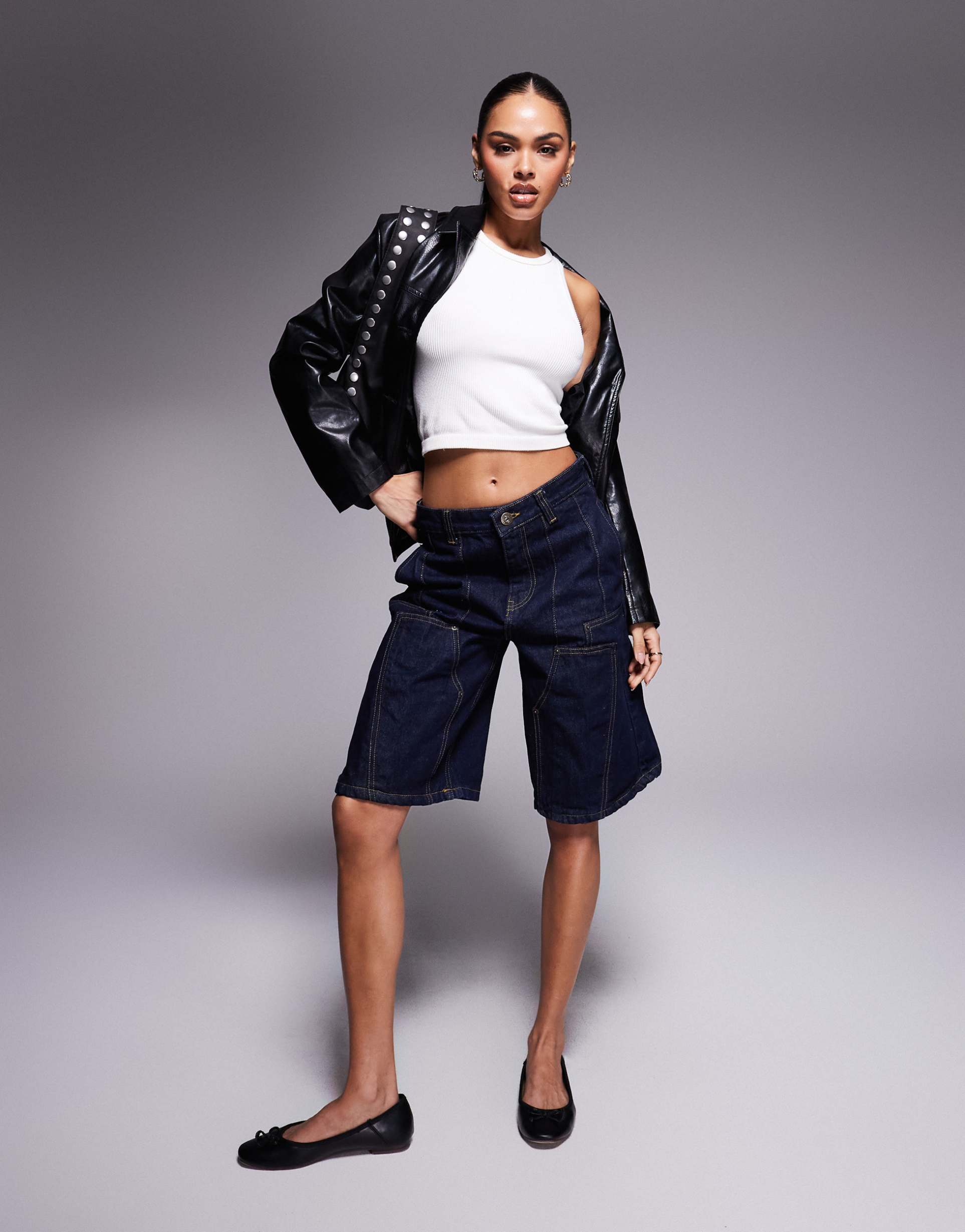 Redefine weekend denim with sculpted detail and laid-back ease. These Courtside panel-detail denim jorts in a deep indigo sit at mid rise with a relaxed, wide-leg silhouette that moves with you. Crafted in dense non-stretch cotton denim, they feature paneled panels for a structured, dimensional look and a distinctive back-pocket logo embroidery for subtle branding. Belt loops and a classic zip fly with a button keep the fit secure, while functional pockets complete the laid-back utility. Pair with a cropped tee and a leather jacket for urban days, or a floaty blouse for weekend brunch—cool, versatile, and effortlessly modern.