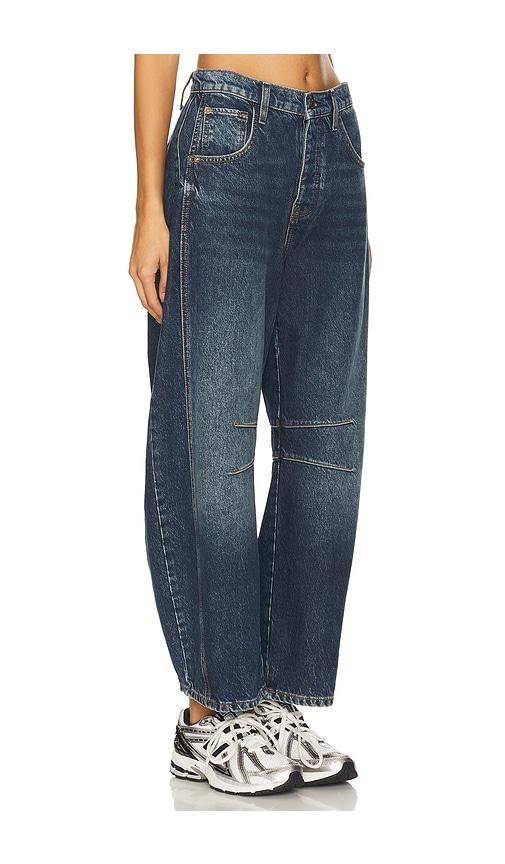 FREE PEOPLE X WE THE FREE GOOD LUCK MID RISE BARREL JEANS IN BLUE.