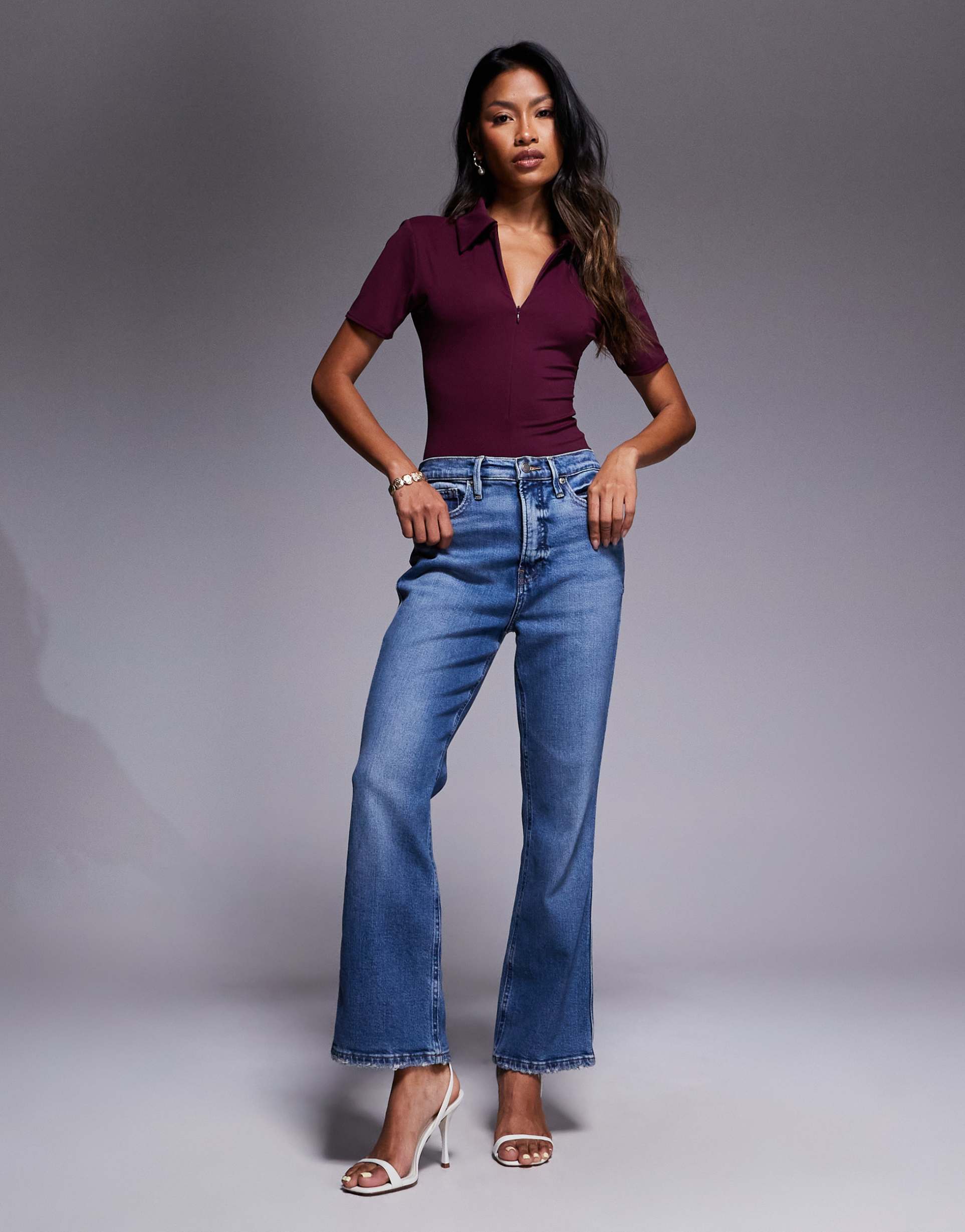 Image features a woman wearing mid-blue wash flared jeans with a high waist and slight distressing. No topwear is visible or clearly identifiable to extract topwear attributes.