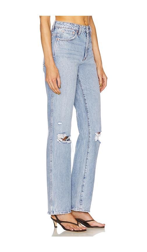 GRLFRND SARA SUPER HIGH RISE SLIM STRAIGHT JEANS IN DENIM-LIGHT.