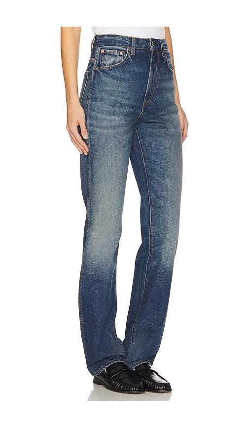 GRLFRND SARA SUPER HIGH RISE STRAIGHT JEANS IN BLUE.