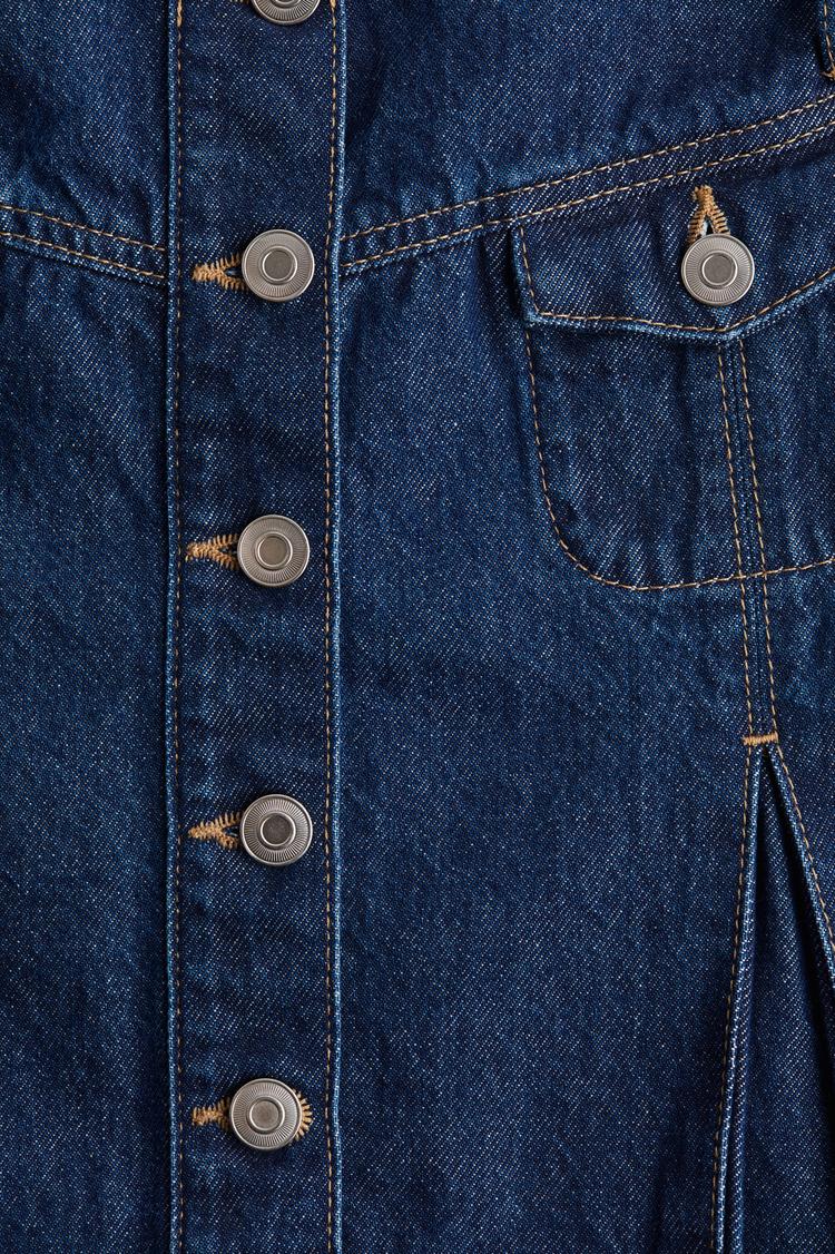 Bring a timeless edge to your casual wardrobe with this classic dark blue denim mini skirt. Crafted from durable denim, it features a flattering fitted silhouette with a mid-rise flat-front waistband and a charming button-front closure. The skirt is detailed with neat pleats at the hem that add subtle movement and style, complemented by functional front pockets. Perfect for spring through autumn, this versatile piece effortlessly pairs with blouses or tees for brunch, streetwear, or everyday casual looks. Embrace the modern yet classic appeal of this denim mini skirt to elevate your laid-back ensembles with a polished finish.