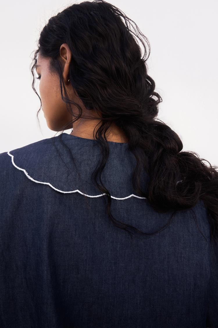 Bring a touch of vintage elegance to your everyday wardrobe with this dark blue denim blouse featuring a beautifully embroidered white floral collar. The regular fit and button-front design offer both comfort and timeless style, while the crisp, clean hemline and subtle pockets add practical charm. Crafted from classic denim fabric, this blouse pairs effortlessly with straight-leg trousers for a polished yet casual look suitable for workwear and relaxed outings in any season. Embrace a refined aesthetic that blends heritage details with modern ease, making this blouse a versatile staple in your collection.
