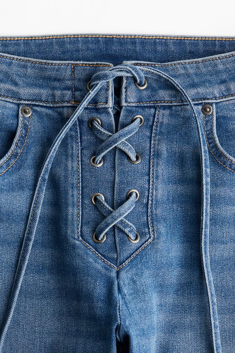 Effortless 70s-inspired charm meets modern comfort in these Flared High Jeans. Crafted from stretch denim, they hug through the waist and hips, then flare from the knee to a graceful, full length that skims your shoes. A high-rise silhouette defines the waist, while the lace-up fly with a concealed button adds a playful, cool edge. Classic five-pocket styling and durable, medium-blue denim give you a versatile wardrobe staple you can dress up with a knit top and boots or keep casual with a tee and sneakers. Seamlessly flattering and season-spanning, these jeans redefine everyday chic.