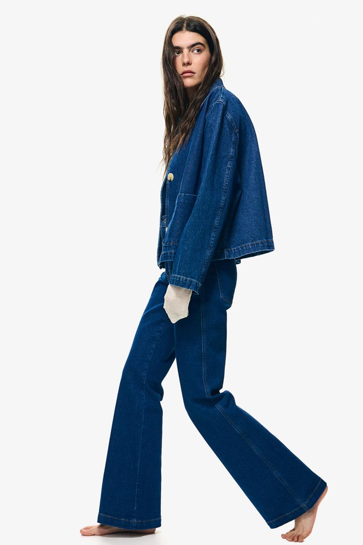 Jeans in rigid cotton denim that feels firm at first, softening and relaxing with wear. Regular fit from waist to thigh and flared from knee to hem. Extra-high waist, zip fly with button, patch front pockets, and patch back pockets. Wide, regular-length legs, designed to fall at top of foot with little or no stacking. A defining shape from season to season.