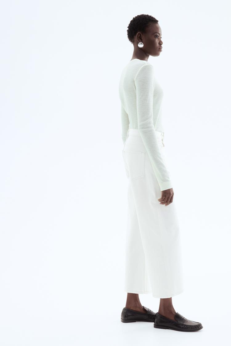 Effortless in crisp white, these high-rise wide-leg cropped jeans bring a clean, modern silhouette to everyday looks. Crafted in cotton denim with a touch of stretch, they hug the waist before falling into a generous, relaxed wide leg that ends above the ankle for a breezy, contemporary line. A classic five-pocket jean with a zip fly and button closure keeps the look sleek and practical. The pure white finish makes them endlessly versatile—team with a knit for cool-weather polish, or a breezy tee and sandals for sun-splashed days. Elevate your casual wardrobe with this minimalist essential.