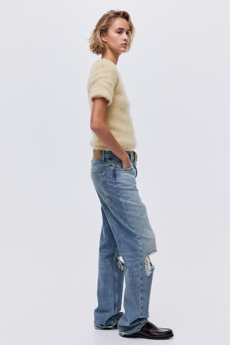 Redefine casual with a timeless staple: these straight high-rise jeans in classic light blue denim. Crafted from durable cotton denim with a soft texture, they feature a flat-front waistband and a regular fit that skims the legs down to a clean hemline. The distressed details at the knees add a modern edge without overwhelming the classic silhouette. Perfect for everyday wear, these jeans pair effortlessly with sweaters and sneakers for relaxed weekend vibes or can be dressed up for casual outings. Embrace versatile style and comfort with these wardrobe essentials that balance trend and tradition.