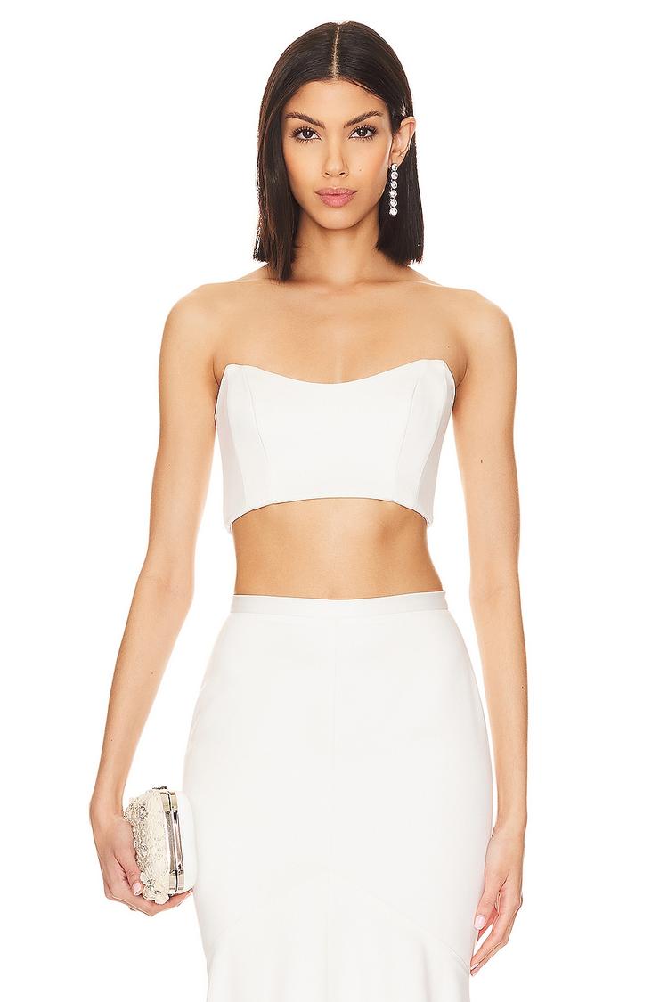Structured boning and a straight neckline define this elegant cropped corset top in lustrous off-white ponte fabric. The fitted silhouette and strapless design make it perfect for cocktail parties, date nights, or glamorous evenings out. Finished with a covered back and zipper closure, it combines sophistication with modern chic style.